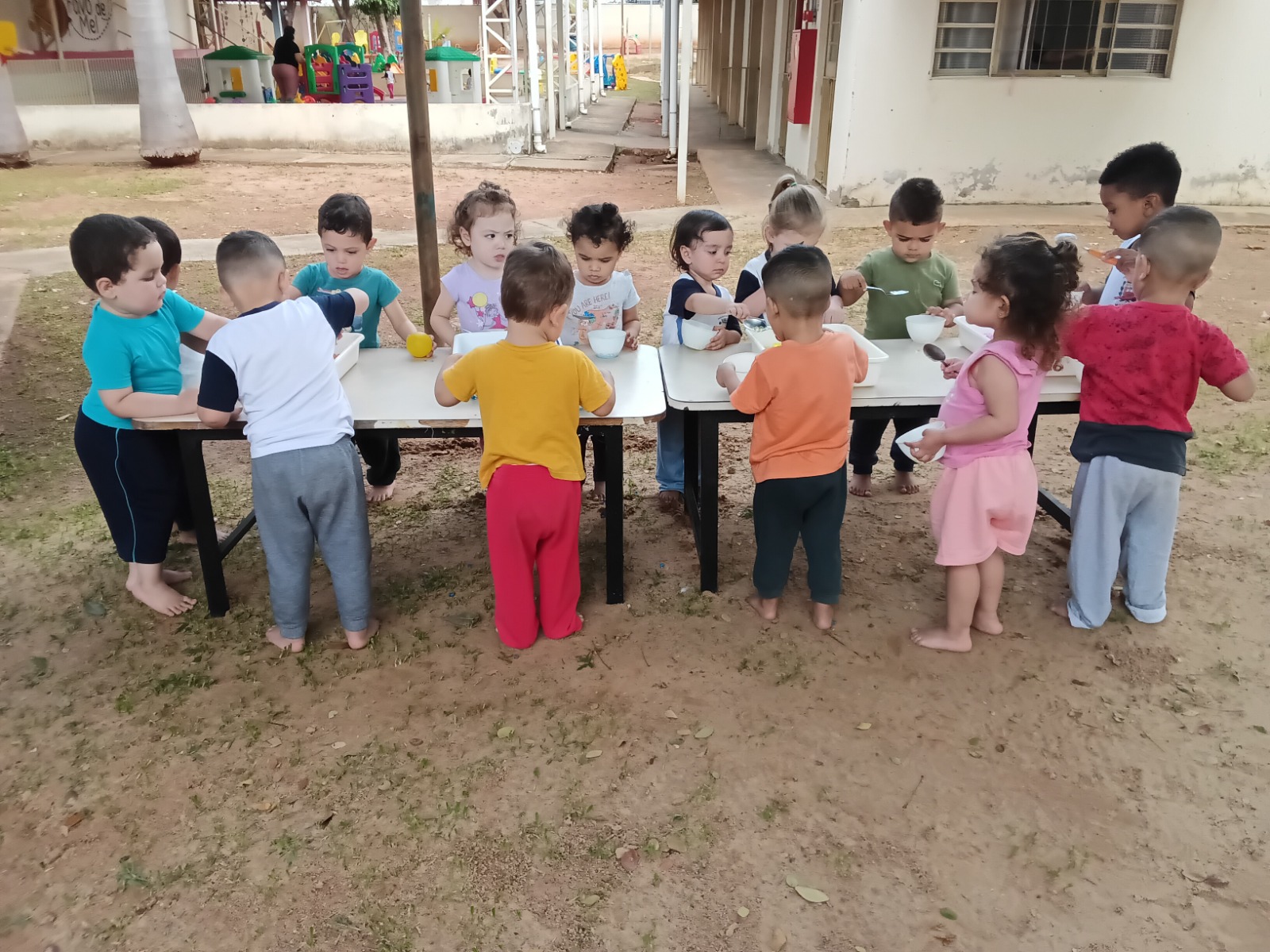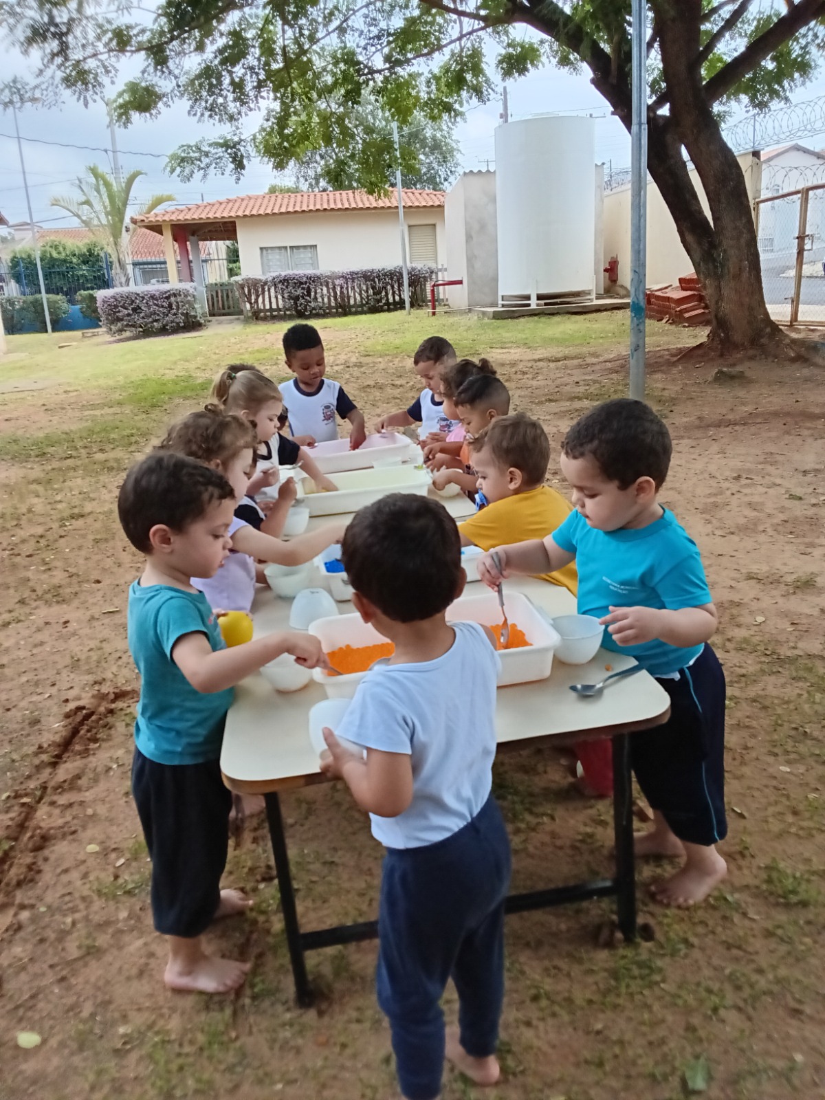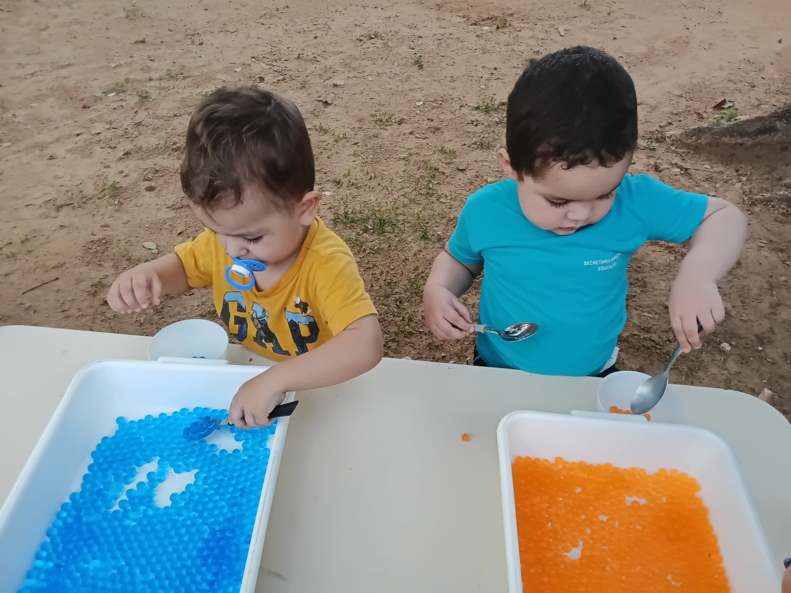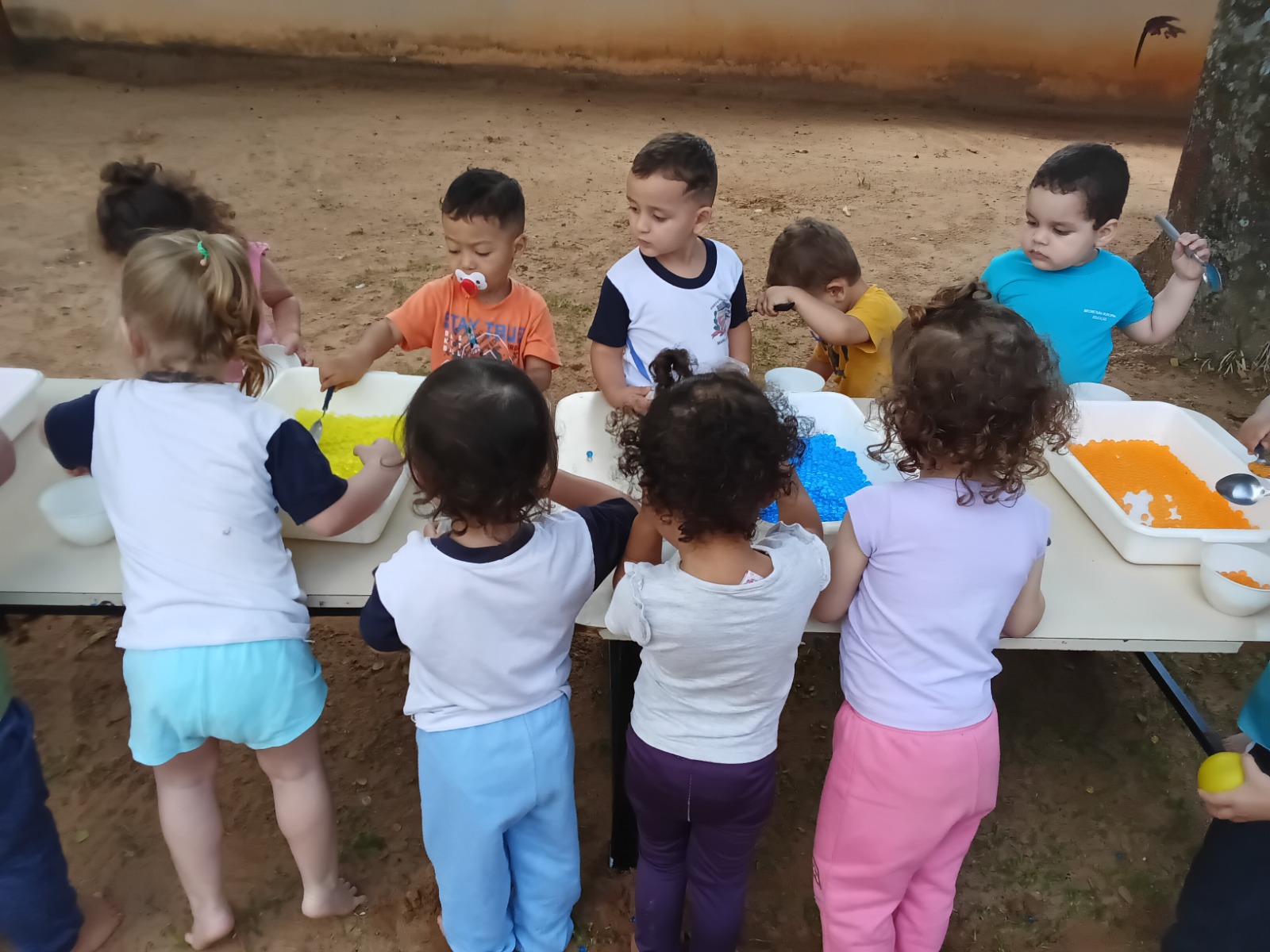 A turma do NII A, sob a condução da professora Edna e das auxiliares Gabi e Juliana, teve a oportunidade de explorar bandejas de experimentação contendo bolinhas de gel, potes e colheres. As cores vibrantes das bolinhas despertaram o interesse de toda a turma, que manuseou os materiais com destreza, curiosidade e autonomia, vivenciando momentos ricos de exploração sensorial.