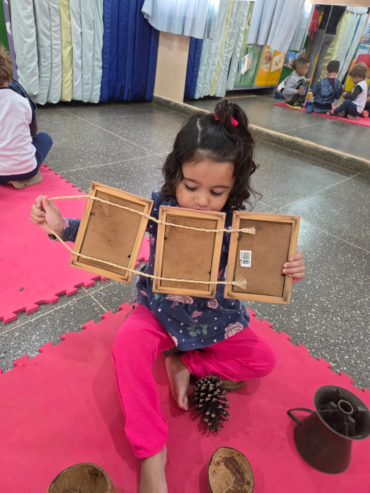 Assim organizamos em cima de tatames, vários objetos para serem explorados, como: copos e canecas de plástico, peneiras, cocos secos, pinhas, tocos de madeira, pratos diversos, galhos com folhas verdes, coadores de café e portas retratos de madeira.