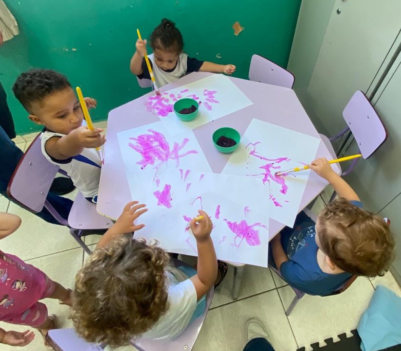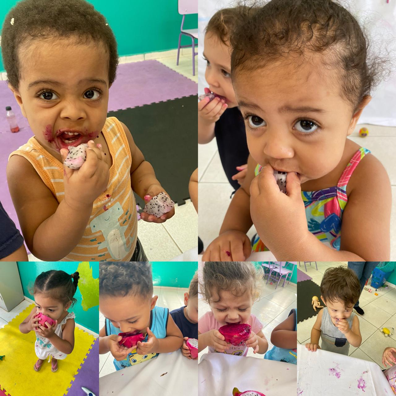As crianças do Maternal 1 A, da professora Márcia, tiveram a oportunidade de explorar a pitaya, sentir o cheiro, textura, sabor e também utilizá-la como tinta natural realizando lindas obras de arte.