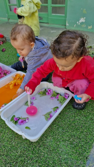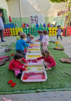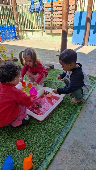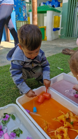 As crianças tiveram a oportunidade de vivenciar uma rica experiência sensorial e explorar flores colocadas na água em diferentes cores, texturas e aromas.