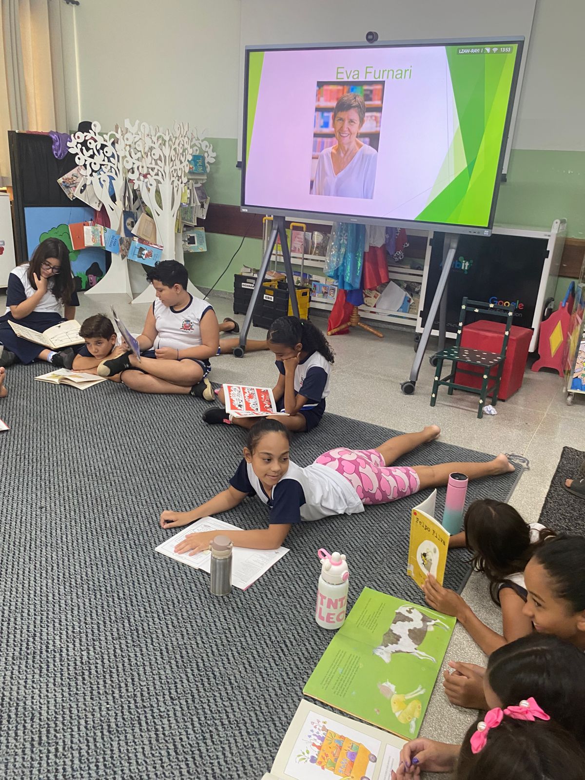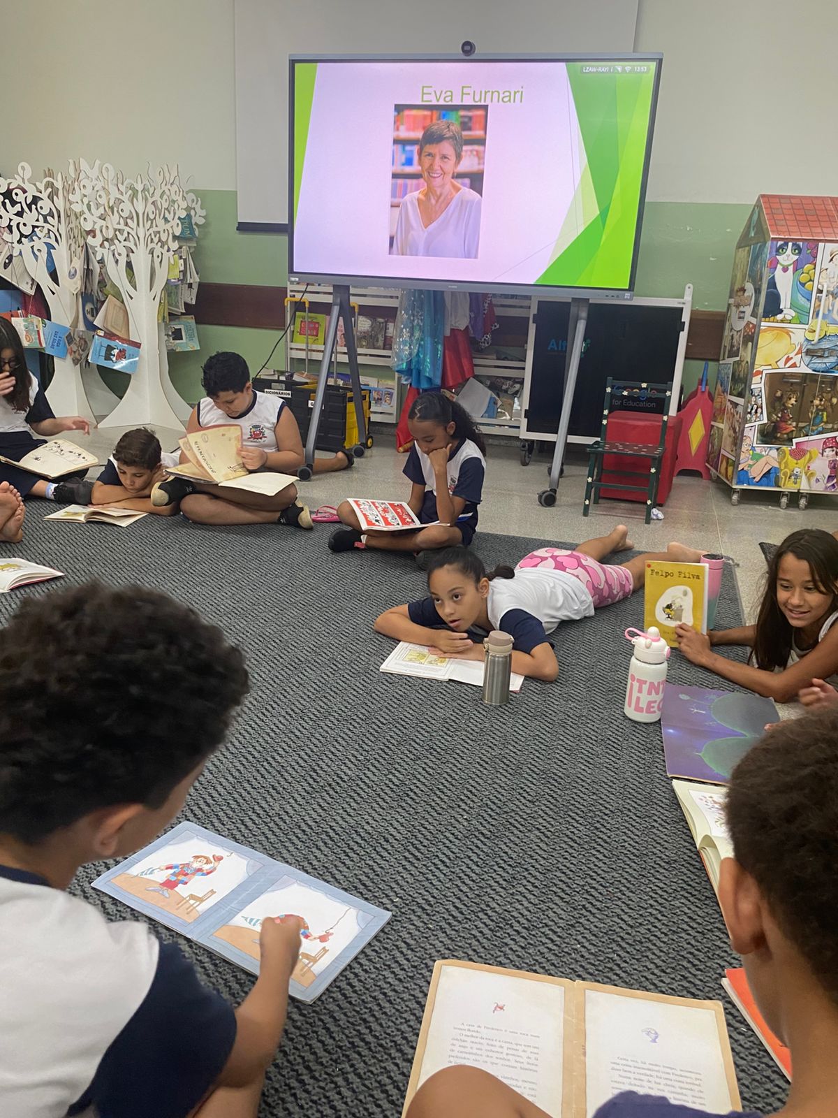 Roda da leitura com contexto para introduzir o projeto de leitura com a escritora EVA FURNARI, no 5° ano C.