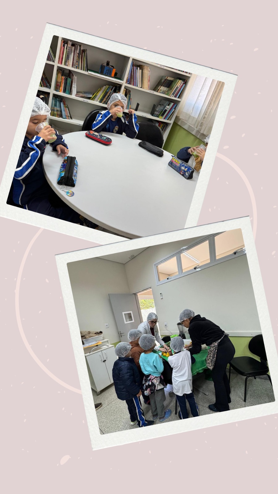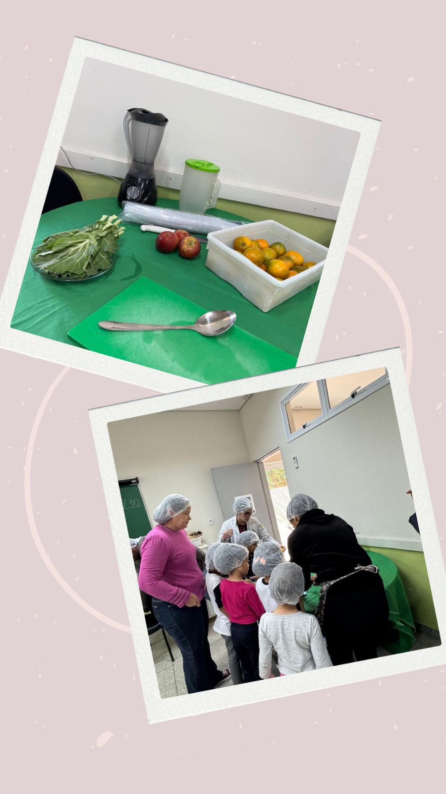 A atividade incluiu a apreciação do vídeo musical “Quem Quer Ser Inteligente”, que, de forma lúdica e divertida, destacou os benefícios de uma boa alimentação. Em seguida, os alunos exploraram diversas frutas e vegetais, observando suas cores, texturas e aromas, o que despertou curiosidade e encantamento.O momento mais esperado foi o preparo do “Suco do Hulk”, elaborado com ingredientes naturais e nutritivos.