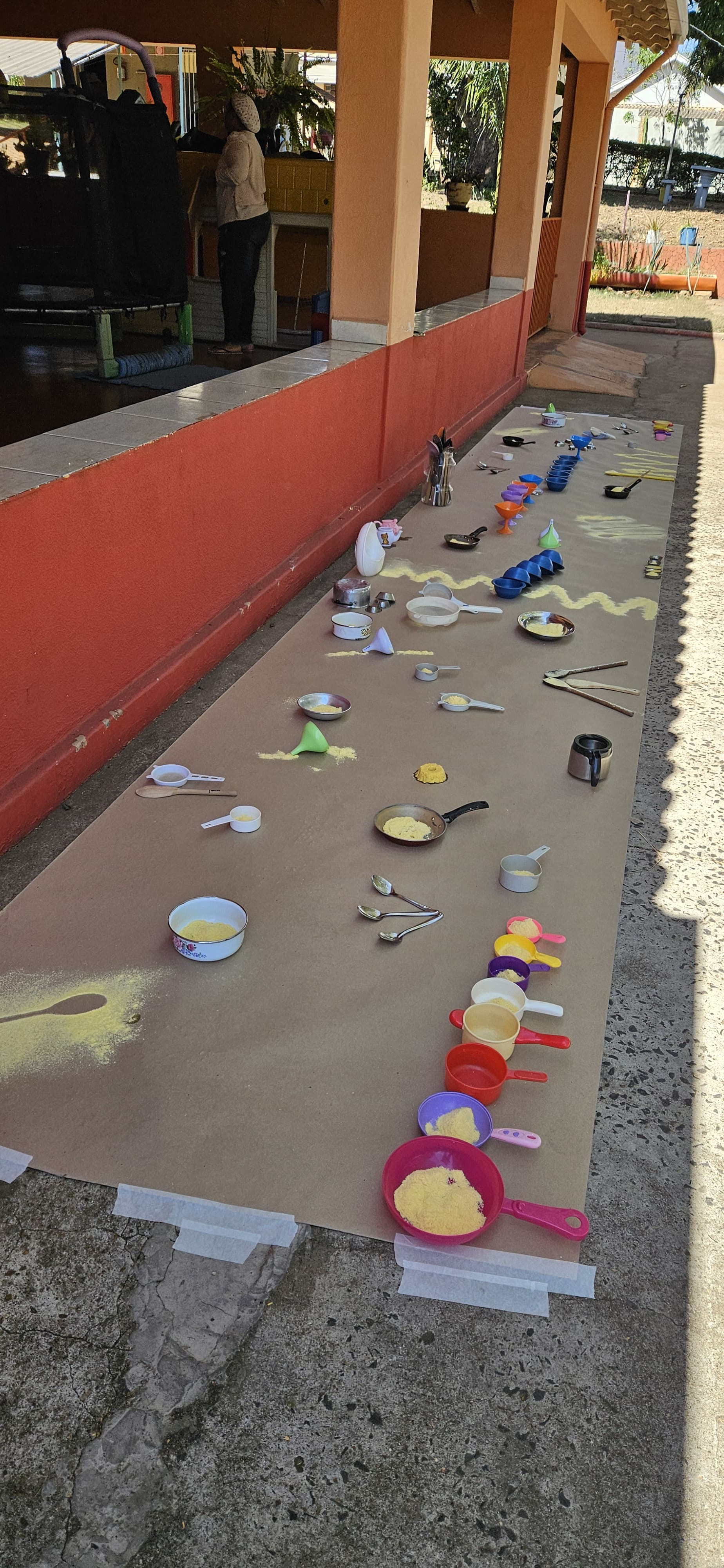 Num ambiente de forma esteticamente convidativo, macarrão, potinhos e utensílios foram dispostos de maneira acessível e atrativa, incentivando a curiosidade e a interação.Ao proporcionar um ambiente rico e provocante , a professora está criando oportunidades para que as crianças explorem e aprendam através da atividade prática e do brincar : variedade de cores do macarrão atrai a atenção das crianças, aguçando a percepção visual e o reconhecimento de cores, o contato com o macarrão cozido oferece uma experiência tátil rica, permitindo que as crianças sintam diferentes texturas e temperaturas, essencial para o desenvolvimento sensorial, manipular o macarrão e os utensílios desenvolve a habilidade motora, as crianças experimentam causas e efeitos, como o que acontece quando o macarrão é colocado dentro de um pote ou derramado e durante a atividade, a interação verbal entre crianças e professora é incentivada, ampliando o vocabulário e a capacidade de expressão.