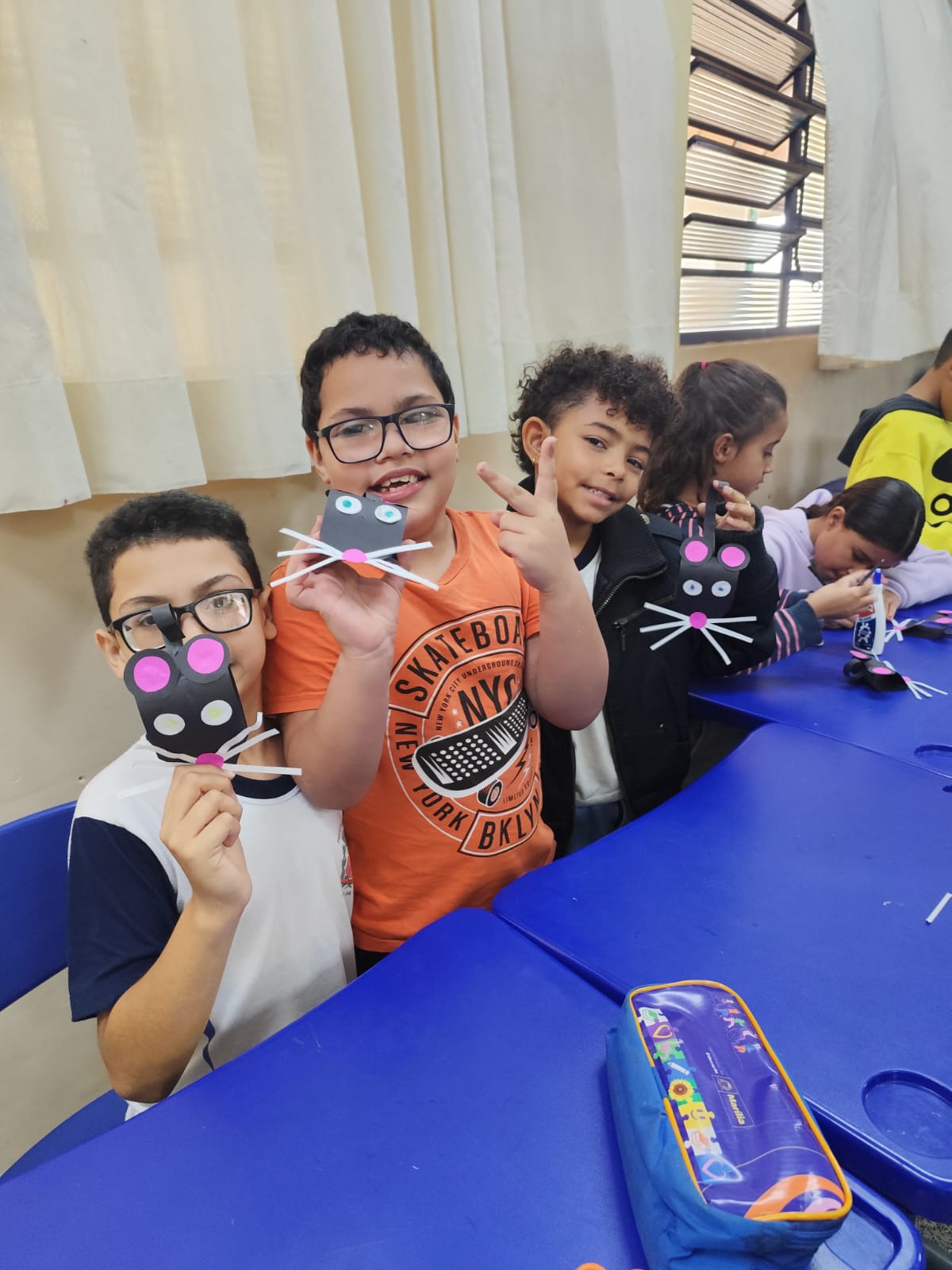 O quarto ano A também se envolveu em uma sessão de mediação com a turma do segundo ano B. Os alunos fizeram a leitura prévia da história, prepararam junto com a professora materiais para levarem aos menores para poderem findar a leitura com uma atividade prazerosa. Os alunos do quarto ano A levaram “O Grúfalo” aos menores e depois fizeram a dobradura do ratinho, um dos personagens da história. As duas turmas envolvidas adoraram a proposta e já vislumbram outros desses momentos.