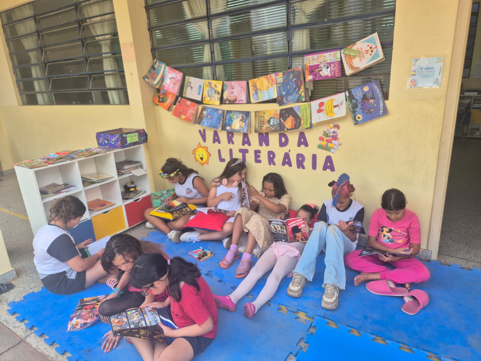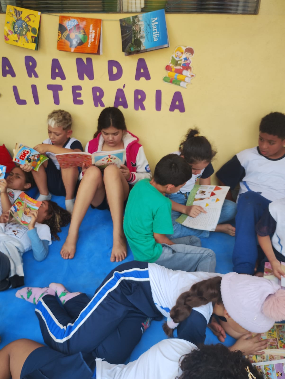 Dentre inúmeras boas práticas que tivemos por aqui, vamos socializar três. A primeira e a segunda dizem respeito à turma do 5º ano C. A professora e a turma organizaram em um corredor a “Varanda Literária”, onde expuseram livros, gibis, tatames e almofadas, criando um espaço para que a escola como um todo pudesse se beneficiar. E foi um espaço MUITO explorado por todos os anos.