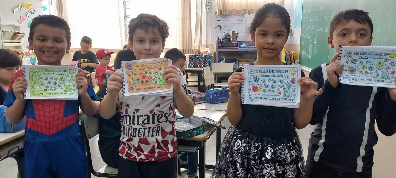 Alunos da EMEF Professor Célio Corradi recebem os kits do Programa Leitura em casa: formando pequenos leitores.