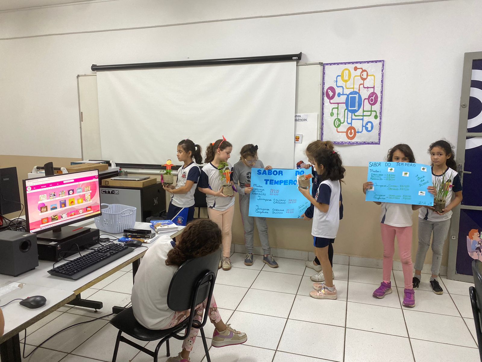 Alunos dos 2º anos divulgam os produtos que serão vendidos na feira do SEBRAE.