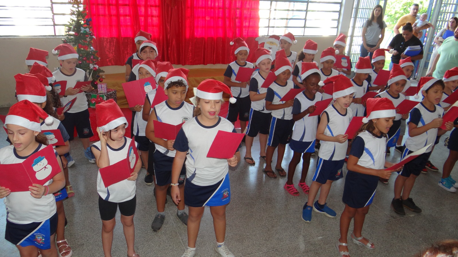 Alunos dos 1º aos 4º anos apresentam cantata de Natal durante a reunião de pais do 4º bimestre.