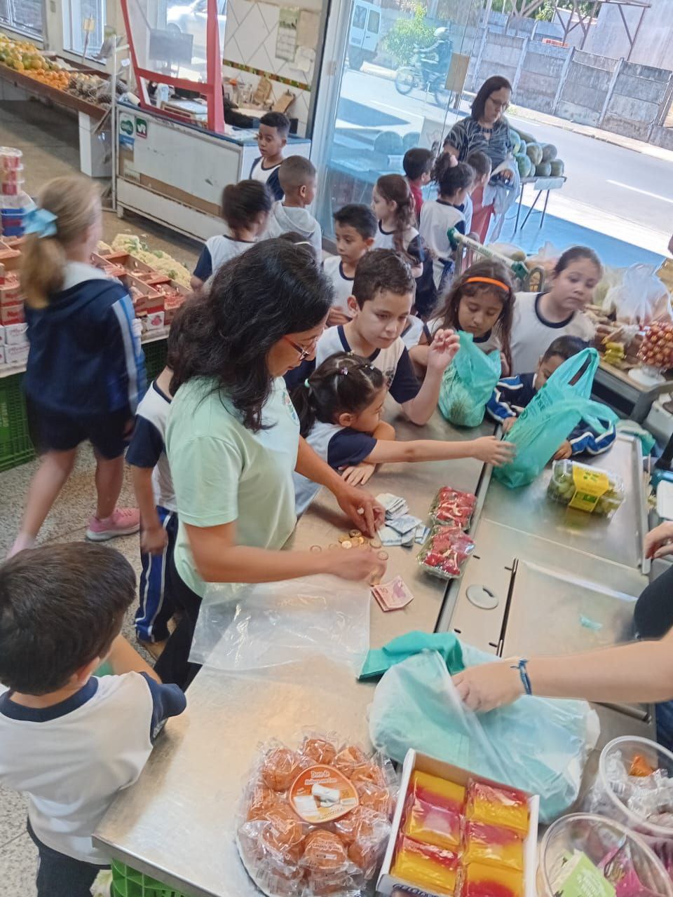 Com a lista em mãos, a turma foi até o varejão local. Durante a visita, os alunos observaram os preços, pesaram as frutas, fizeram perguntas aos vendedores e participaram da escolha dos ingredientes — uma rica experiência de matemática e ciências na prática.