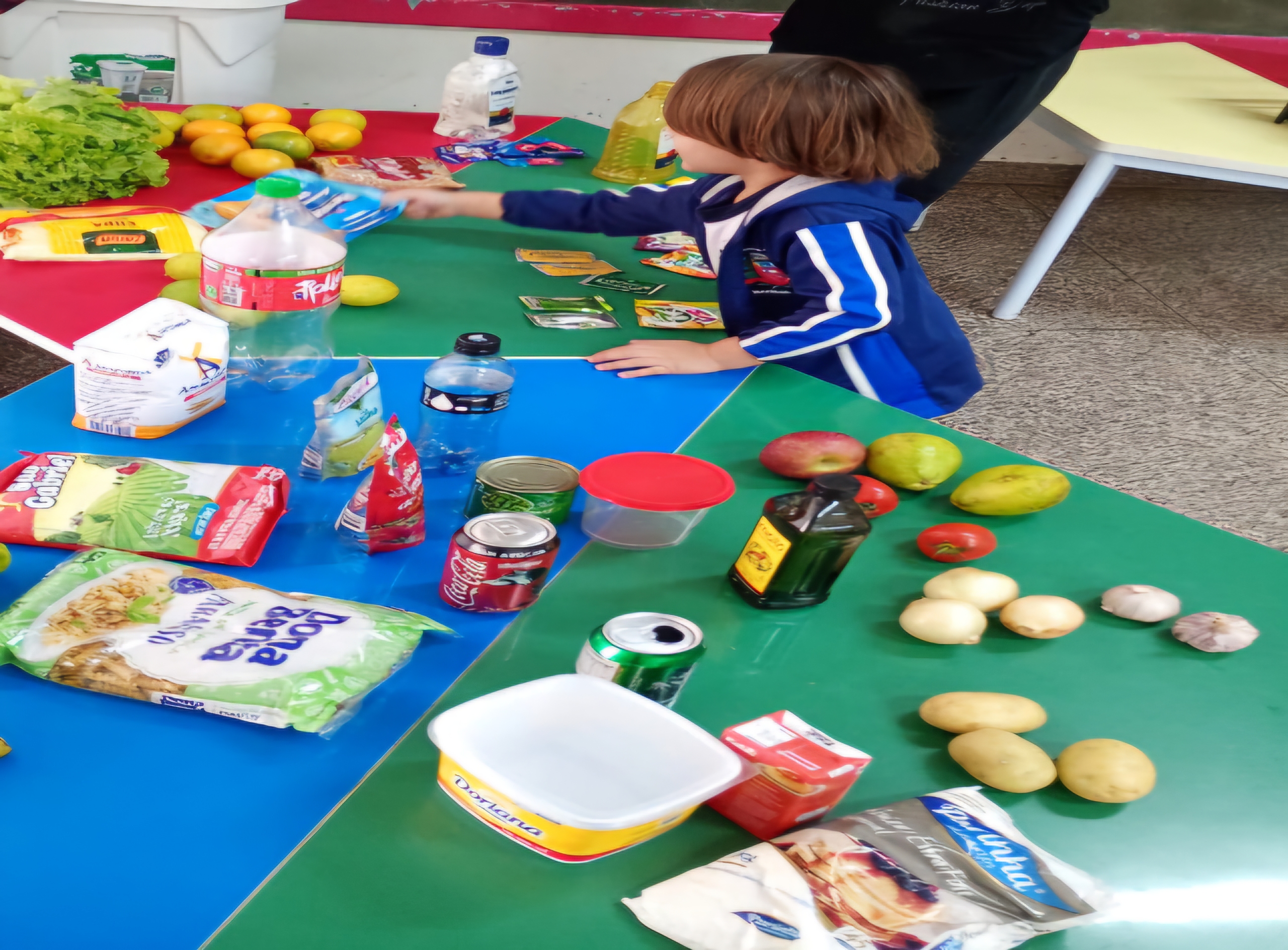 Ampliando e sofisticando o momento de separação e classificação dos alimentos, as turmas foram também convidadas a separar vários alimentos reais em proposta de contexto investigativo por meio de cestas intituladas saudáveis e não saudáveis, momento de interação diversão e manipulação atendendo a atividade-guia das turmas.