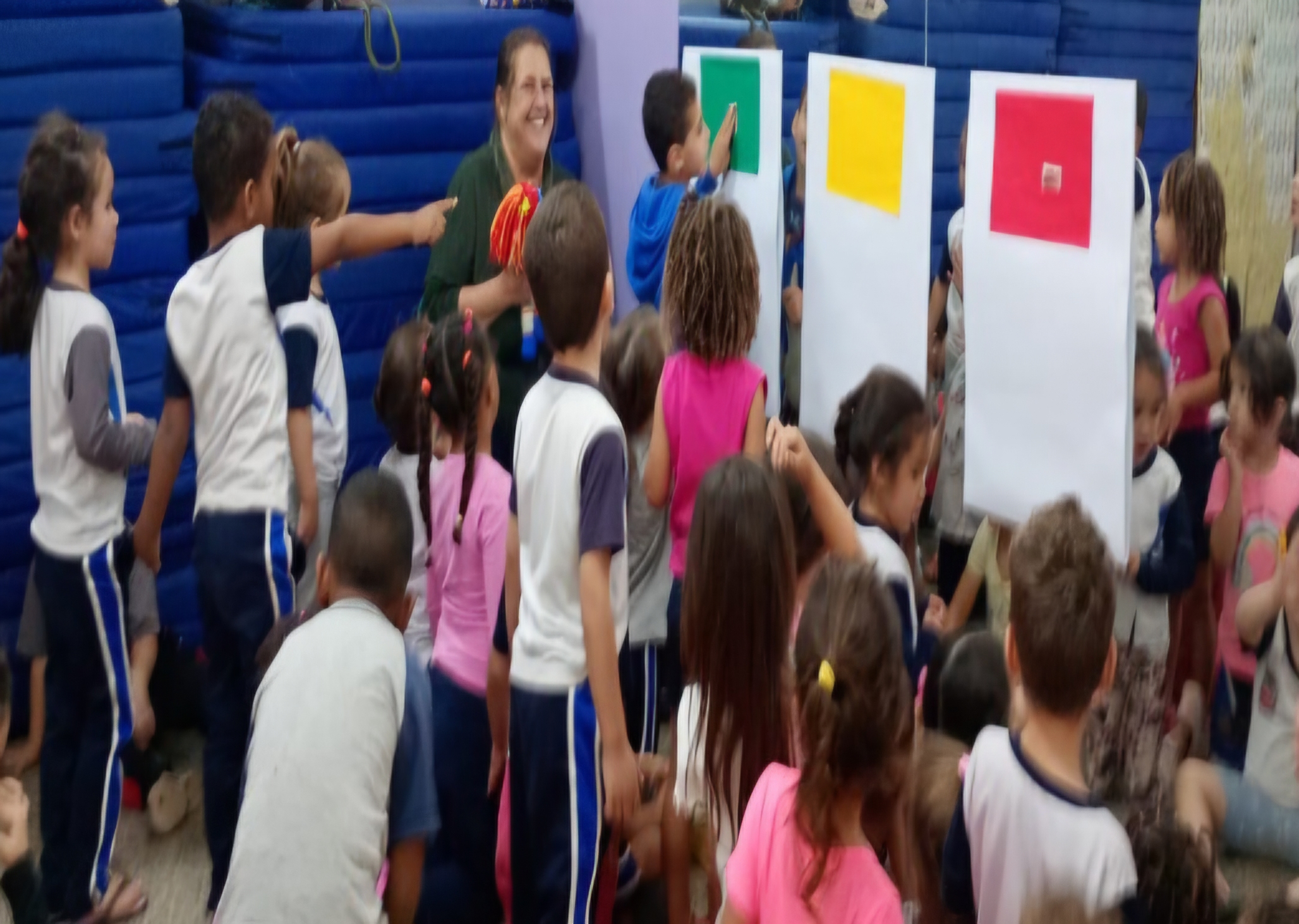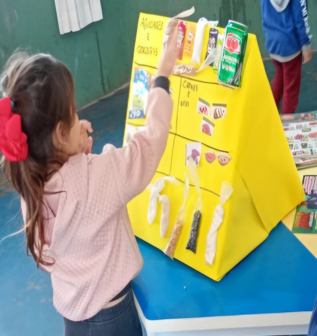 Outra vivência apresentada às crianças foi o convite para montagem da pirâmide 3D de alimentos, onde os grupos puderam participar consolidando as aprendizagens sobre os alimentos importantes para a saúde.
