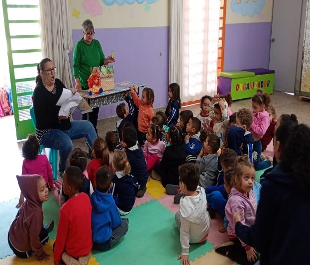 A sensibilização sobre o tema se iniciou de forma prazerosa e lúdica por meio da estratégia de contação de histórias inspirado na leitura “A cesta da dona Maricota”, utilizando a personagem Emília recursos de cesta fantoches; seguida por roda da conversa, oportunizando escuta verbalizada nesse momento dos conhecimentos prévios e preferencias alimentares das crianças.