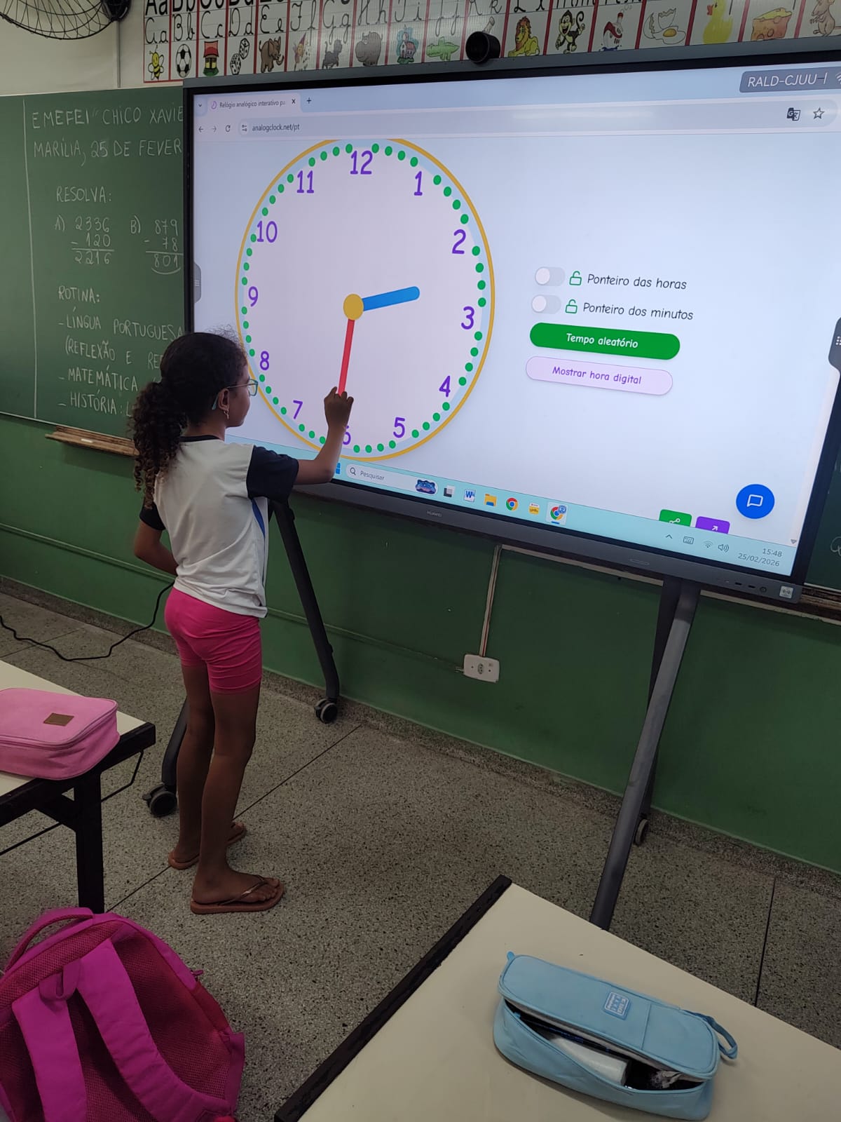 O trabalho com o estudo das horas foi desenvolvido com o objetivo de ampliar a compreensão dos alunos sobre a leitura e a representação do tempo em relógios analógicos e digitais. Durante as atividades, foi utilizado um relógio online interativo, que possibilitou aos alunos manipular os ponteiros para representar os horários solicitados.