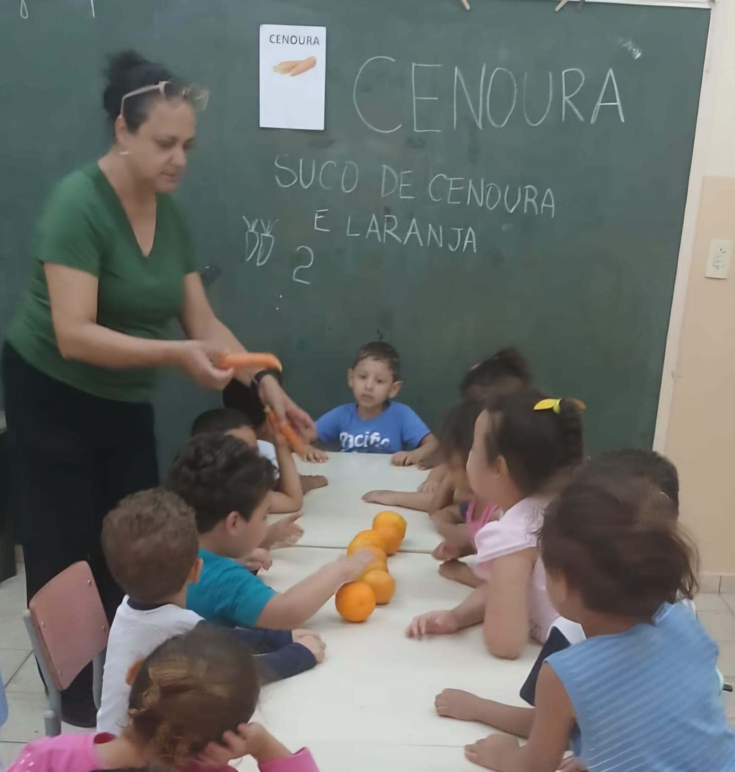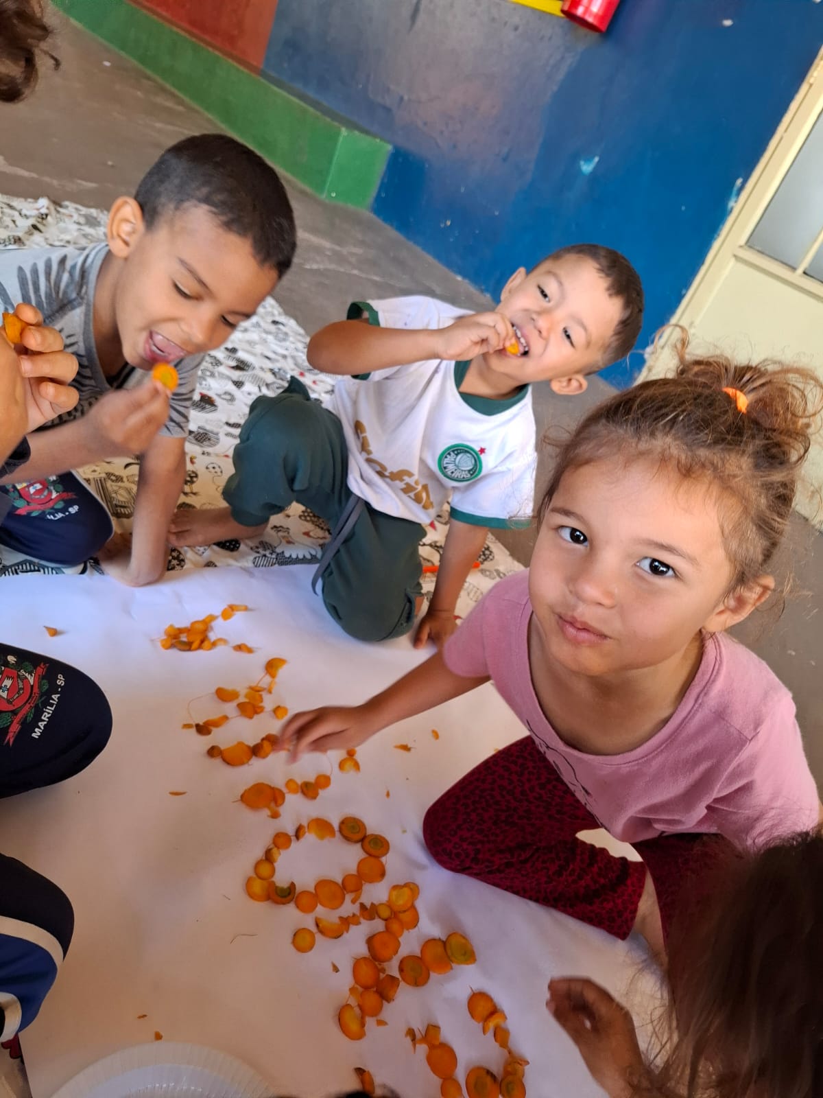 Em uma tarde cheia de cores e curiosidades, as crianças exploraram a cenoura com todos os sentidos — tocaram, cheiraram, provaram e descobriram seus diferentes sabores e texturas. Entre risos e olhares atentos, a aprendizagem se misturou ao encantamento, mostrando que comer bem também é um ato de descobrir o mundo. Assim, o Projeto Alimentação Saudável ganhou vida, nutrindo o corpo, a imaginação e o desejo de aprender.