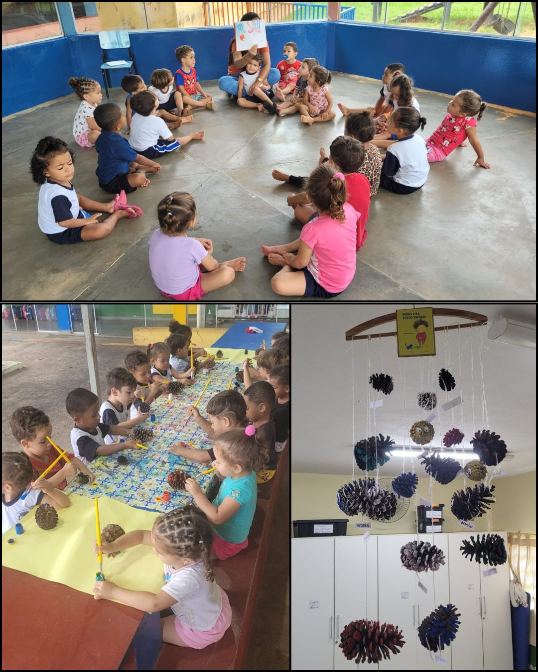 Simultaneamente, a turma Multisseriada A explorou a subjetividade através da leitura do livro "Pedro Vira Porco-Espinho", utilizando a narrativa como mediadora para o reconhecimento e a nomeação de emoções. A intencionalidade pedagógica uniu o campo da escuta e fala à expressão artística tátil, na qual as crianças transformaram elementos naturais (pinhas) em representações simbólicas do personagem. A criação coletiva de um móbile para a sala de referência não apenas decorou o espaço, mas conferiu visibilidade ao protagonismo infantil e à produção artística como forma de registro das aprendizagens. Ambas as propostas, embora com suportes distintos, convergiram para a construção da subjetividade, onde a criança utiliza a arte e a literatura para compreender a si mesma e ao mundo.