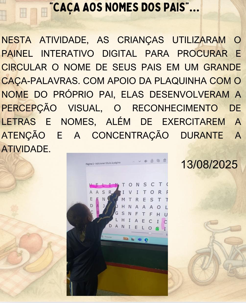 As crianças do Infantil I utilizaram a lousa interativa para procurar o nome de seus pais num grande caça-palavras.