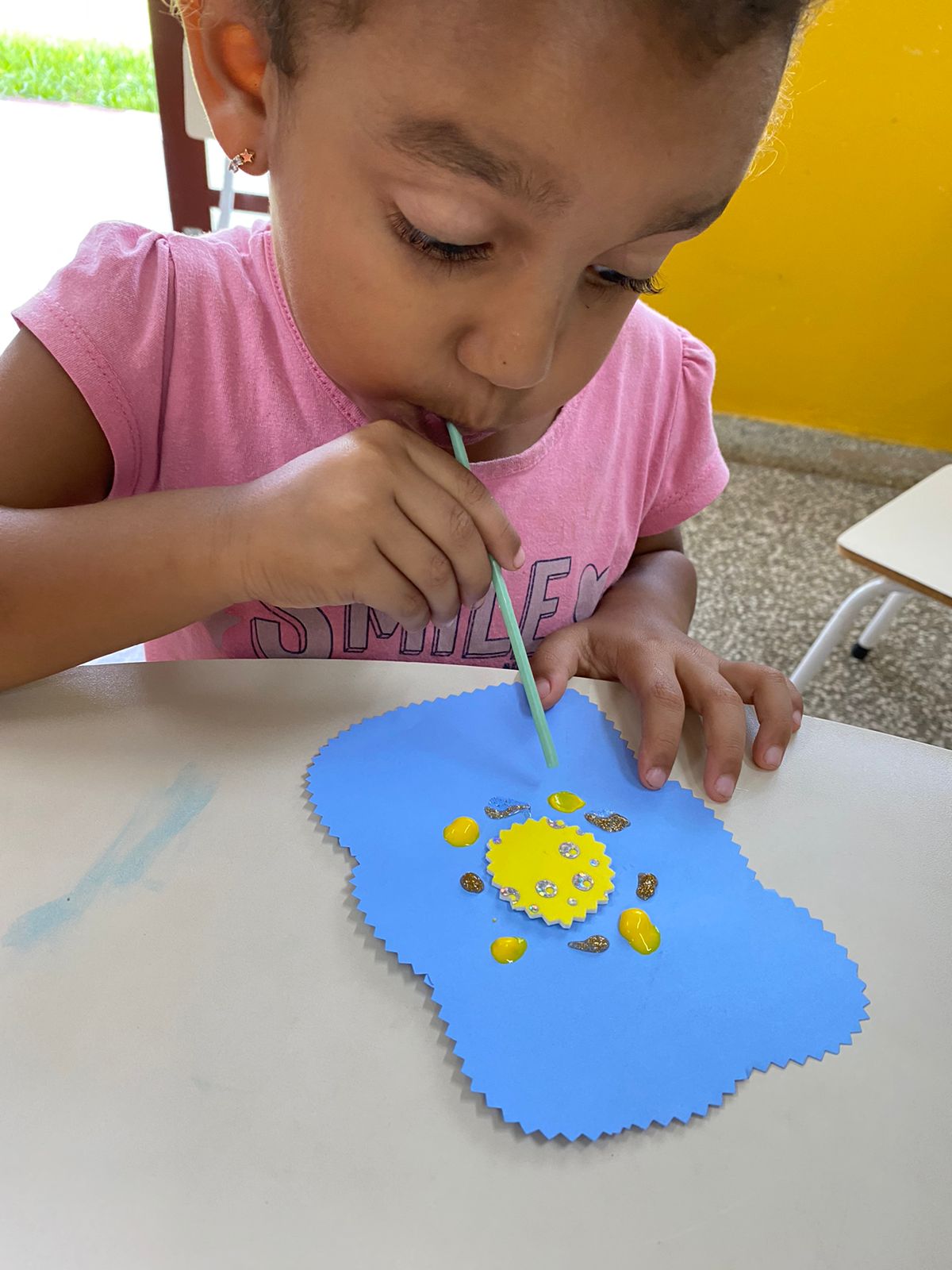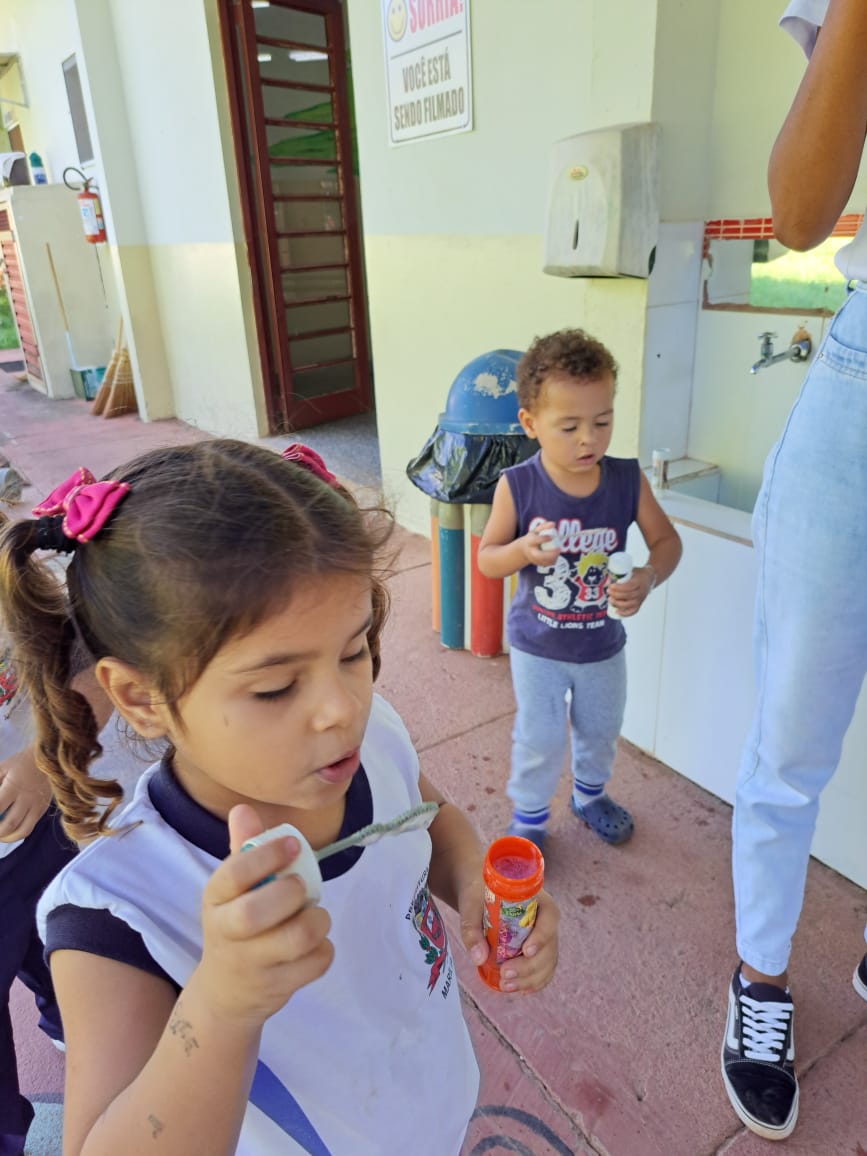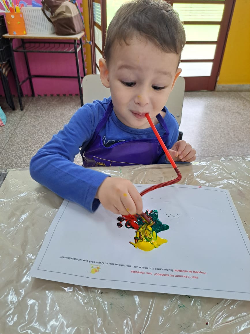 Após brincarem com bolinhas de sabão, observarem a bola maior, contarem as bolinhas, as crianças realizaram a pintura por meio do assopro trabalhando respiração, força, cores e suas misturas.