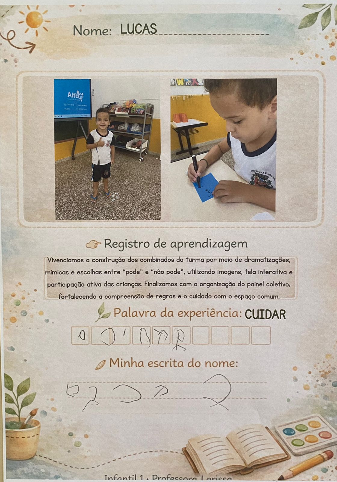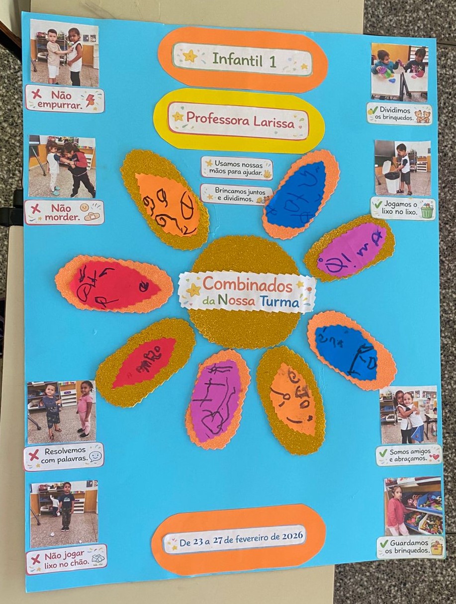 As crianças participaram de uma atividade coletiva para a construção dos combinados da turma. Por meio de dramatizações, mímicas e interação na tela interativa, identificaram atitudes que podem acontecer na turma. As situações foram registradas em cartaz com apoio das crianças, que também participaram da escolha e registro da palavra-chave da semana.