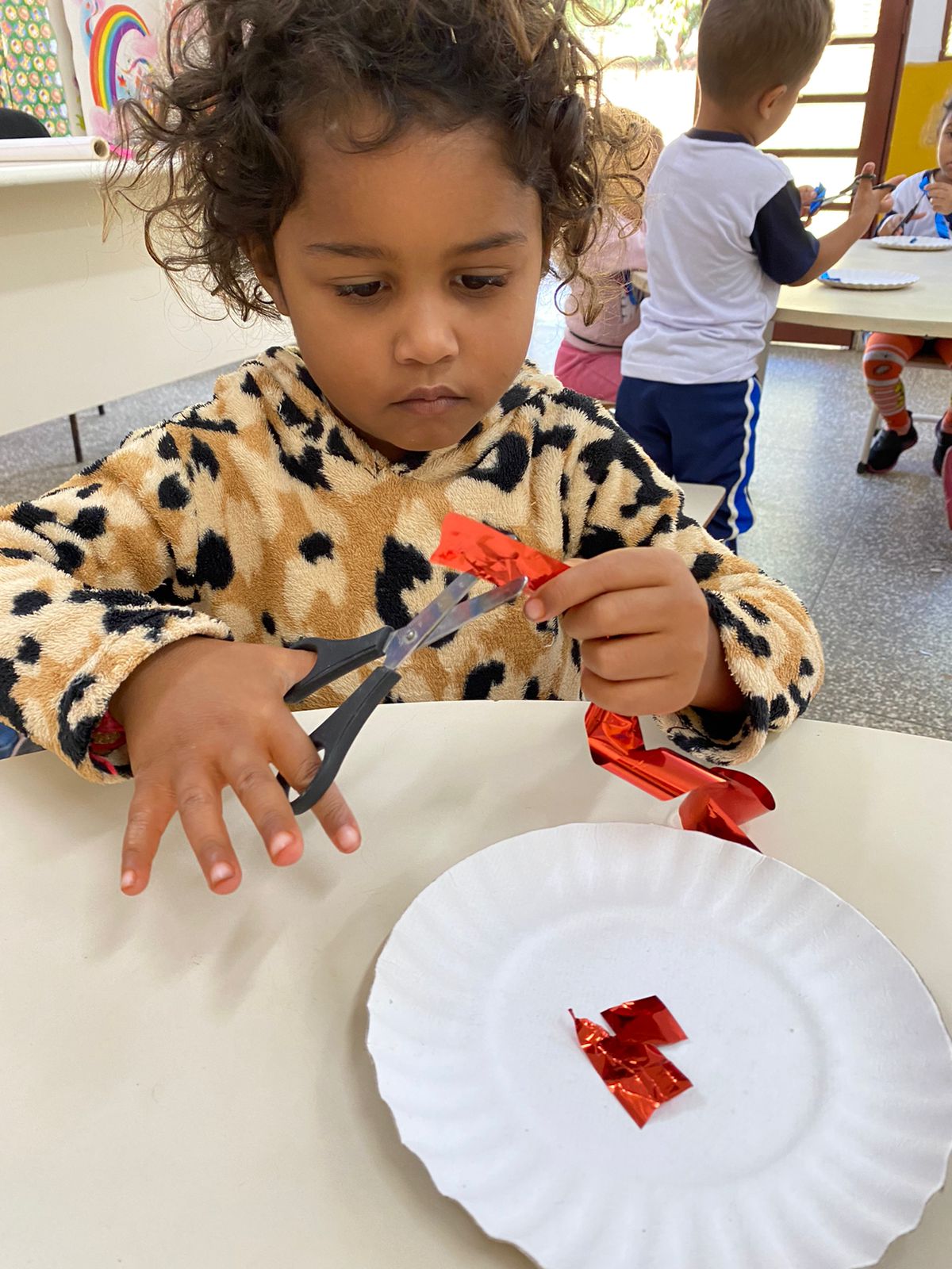 Durante a atividade, as crianças realizaram seus primeiros registros gráficos no ambiente escolar, experimentando diferentes movimentos e traços no papel. Esse momento possibilitou o desenvolvimento da coordenação motora, da percepção das cores e da expressão por meio do desenho.