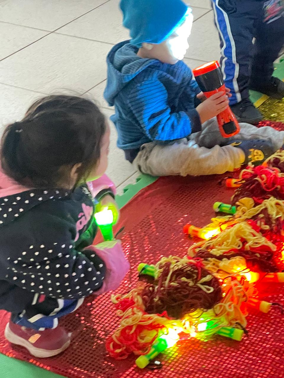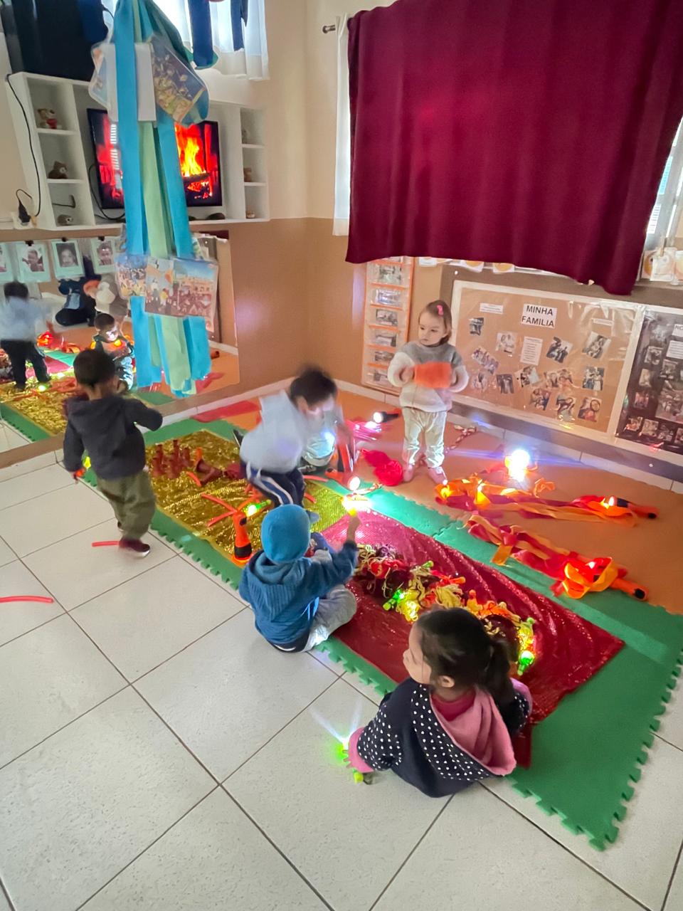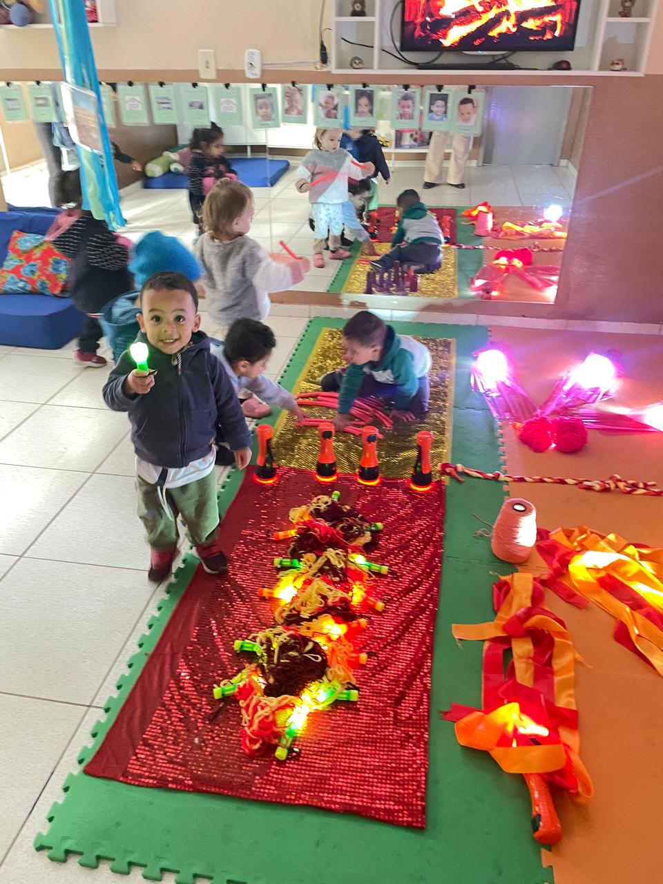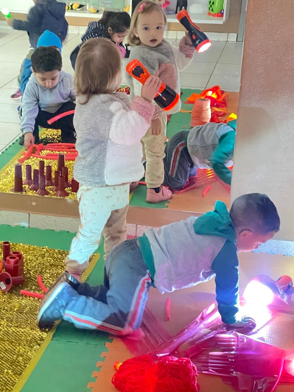 Em um ambiente acolhedor e cuidadosamente preparado, as crianças mergulharam na investigação das luzes e cores quentes. As lanternas se tornaram extensões do olhar curioso, revelando brilhos, texturas e reflexos. Entre tecidos, faixas e sombras, o espaço pulsava descobertas. Cada movimento era uma pergunta, cada feixe de luz, um caminho de exploração sensorial — onde o encantamento, o silêncio atento e a escuta ativa iluminam a potência do brincar que investiga. 🔦✨🧡