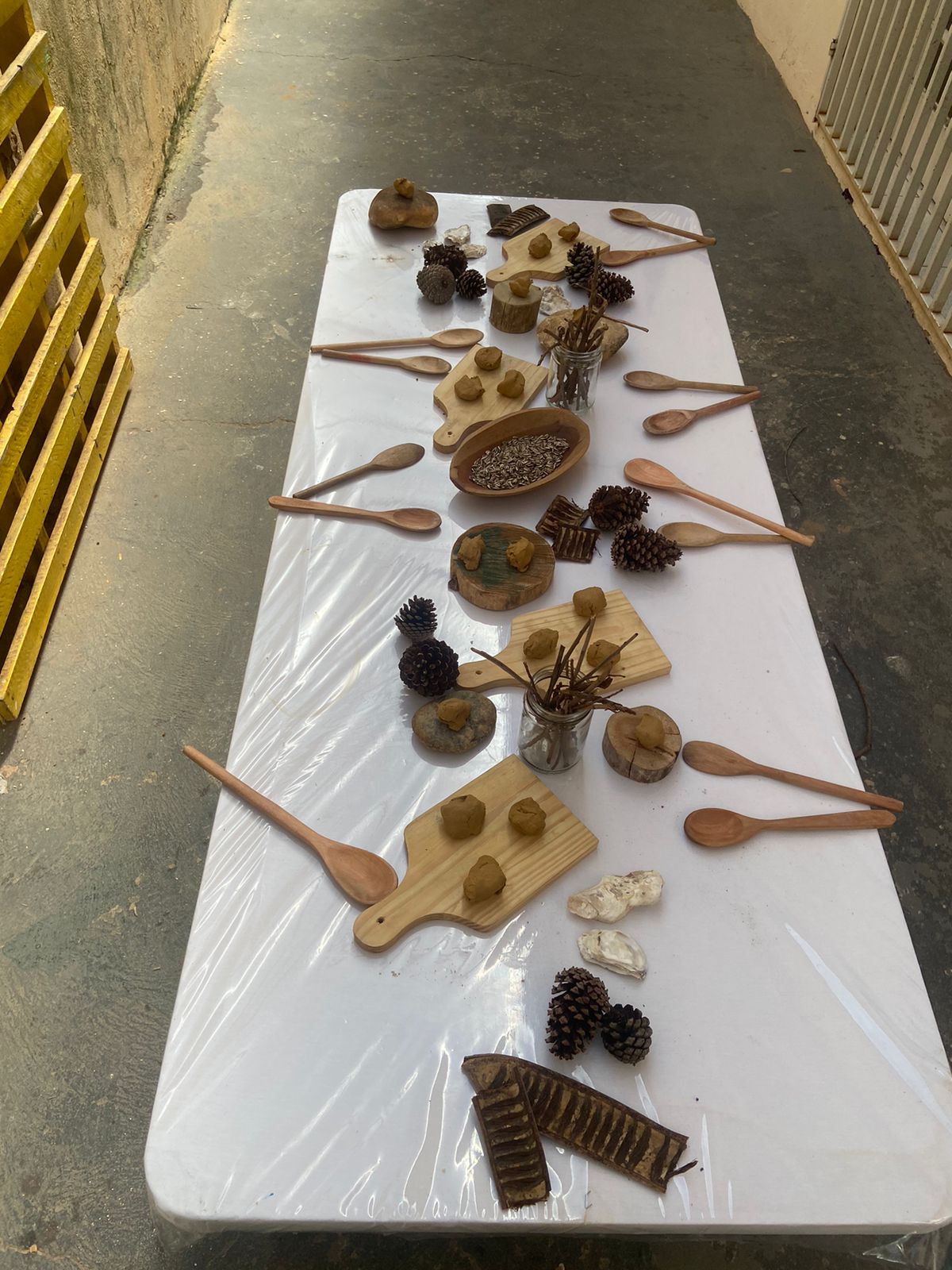O espaço foi organizado com a lama comestível dentro de bandejas em uma bancada para experimentação, foram disponibilizados materiais como as formas de alumínio e colheres, esses objetos possibilitaram muitas combinações, ampliando o repertório de brincadeiras das crianças. Além disso oportunizou uma exploração sensorial ao sentirem o cheiro do cacau, a cor e textura da massa.