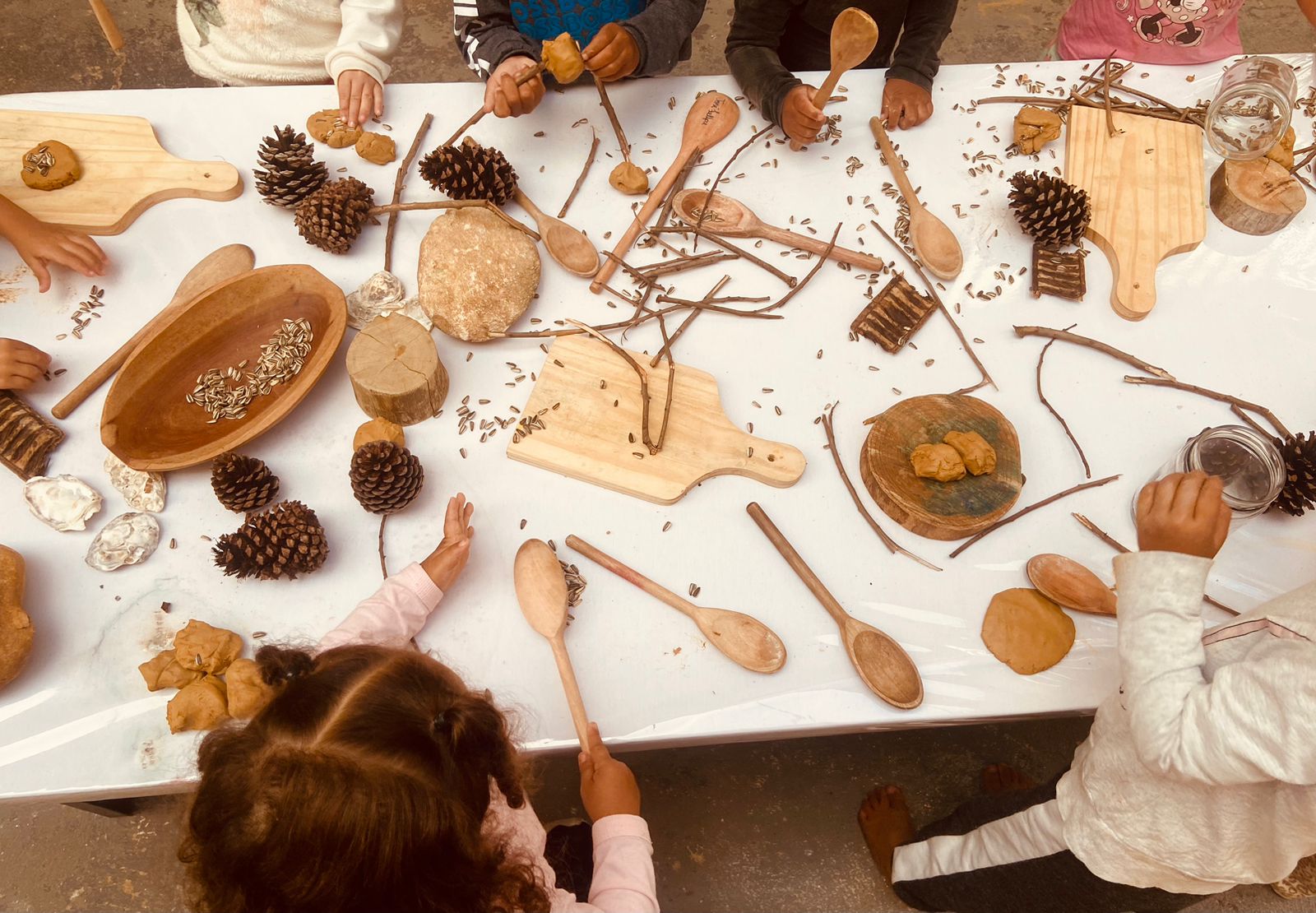 Ao brincar de fazer barro, construir castelos de areia, comidinhas com folhas e frutas que caem pelo chão, descobrem novas formas de brincar com elementos da natureza, essas ações possibilitam muitas aprendizagens na infância.