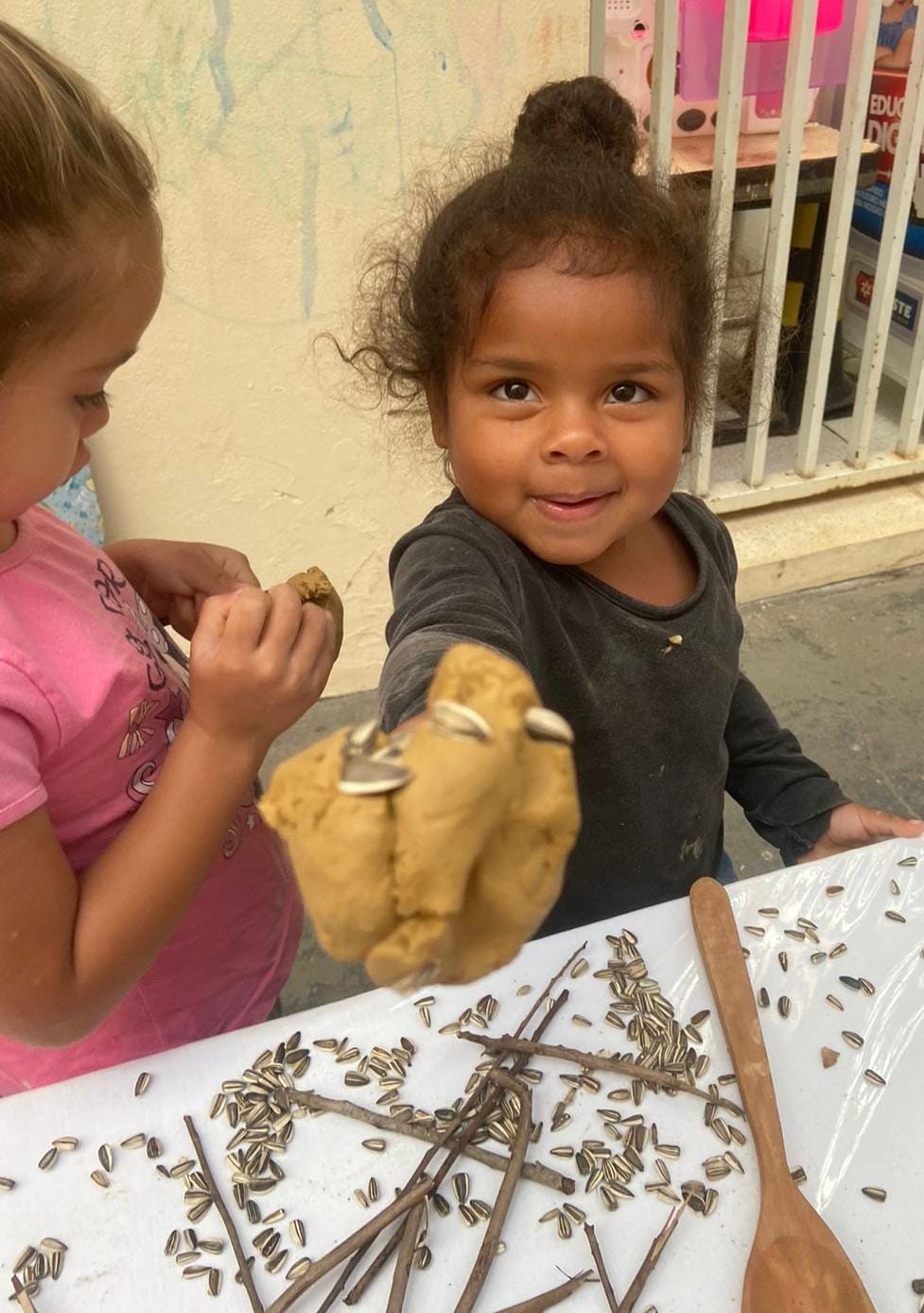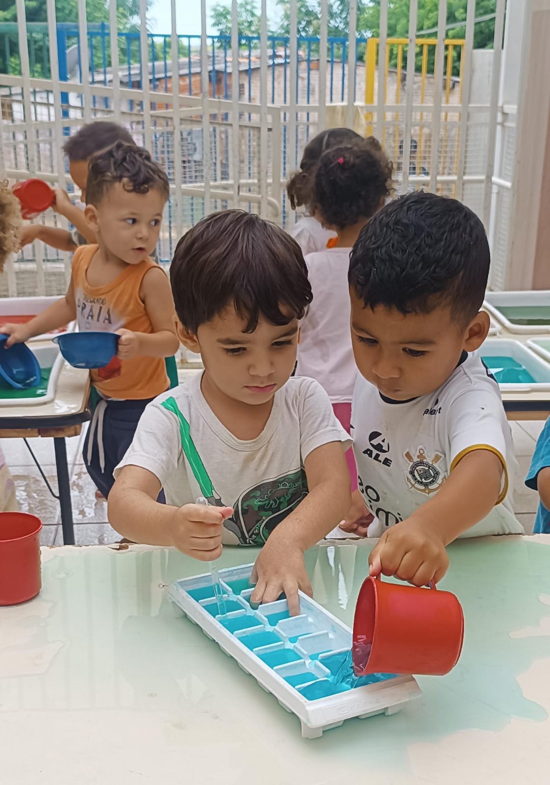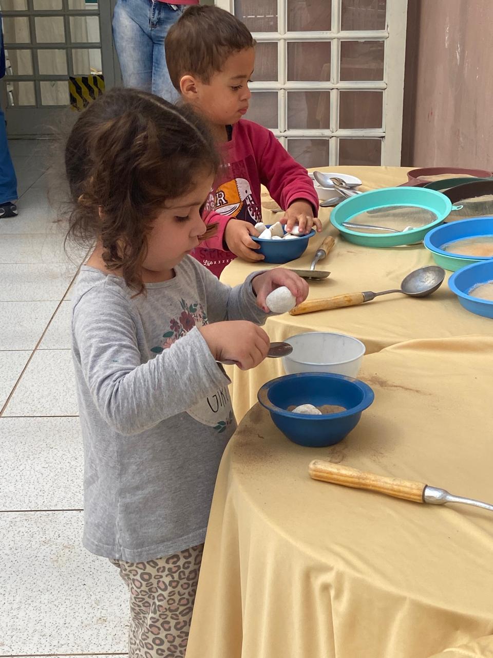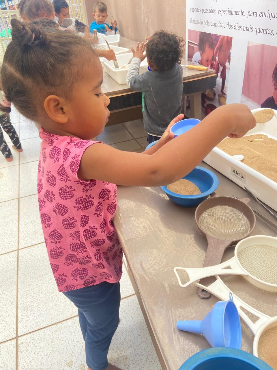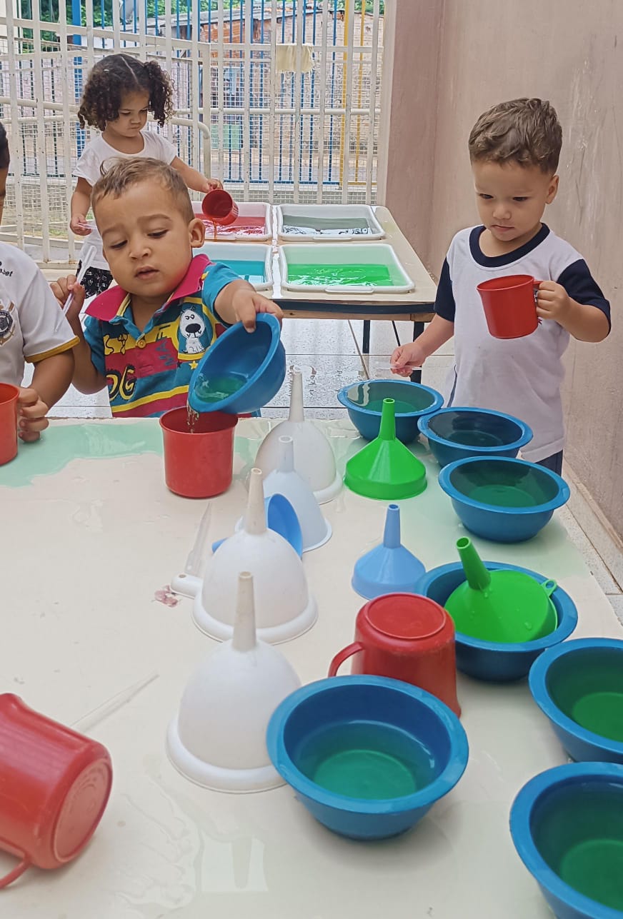 Assim em algumas das sessões realizadas na EMEI Colibri, o Maternal l - B da professora Ana Carolina e da ADE Jéssica, as crianças tiveram a oportunidade de manipular o fubá, feijão, argila, macarrão, bolinhas d’água e vários utensílios como pegadores, colheres de metal, bacias, peneira e funis de plástico. As crianças puderam manusear sentindo suas texturas, diferenciando e transferindo de um recipiente ao outro, trabalhamos assim também os movimentos, agilidade, imaginação, interação e a criatividade.
