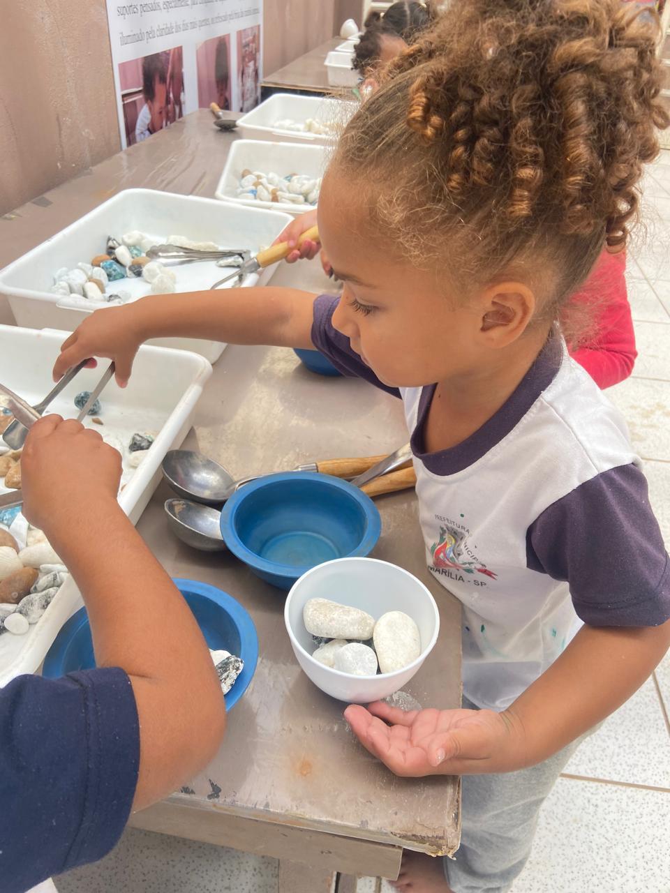 Neste dia, as crianças do Maternal I - B foram convidadas a explorar as bandejas de experimentações! A proposta contou com duas ilhas: uma de materiais contáveis (pedras grandes e pequenas) e outra com não contáveis (areia). Além disso, foram ofertados diversos materiais, como pegadores de inox, funis, peneiras e colheres!
