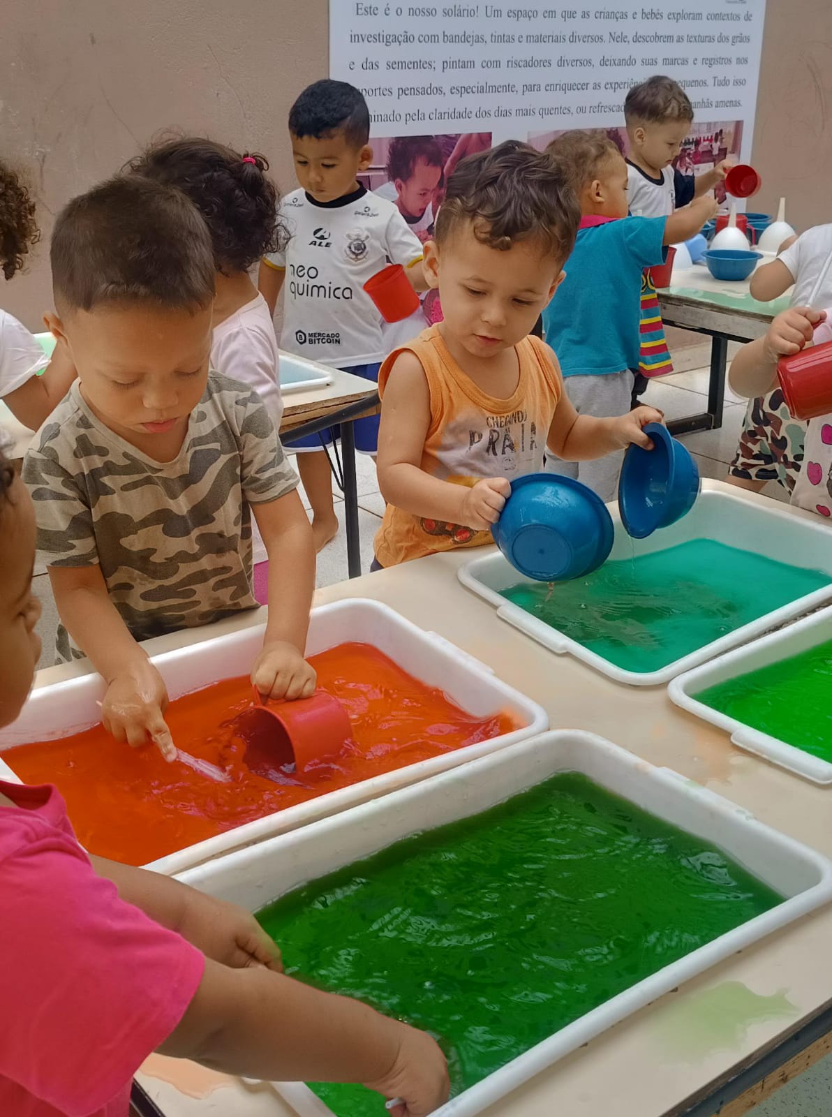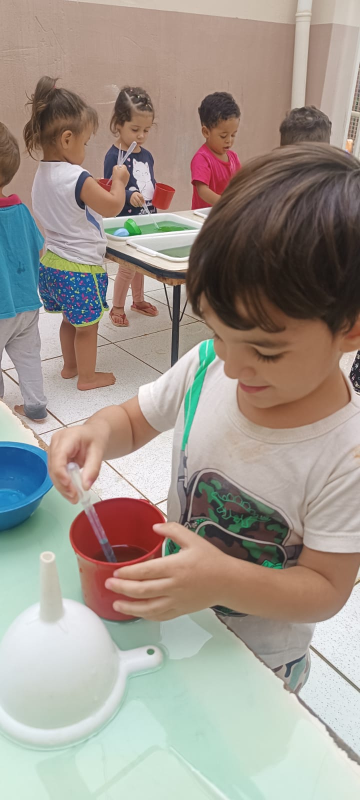 Os pequenos cientistas do Maternal I - A, participaram de um rico momento de descobertas! Nesta atividade sensorial, com pipetas e funis em mãos, as crianças mergulharam na experiência, realizando a transferência de águas coloridas entre os diferentes recipientes disponíveis, explorando cores e movimentos, desenvolvendo a capacidade de investigar, observar e criar.