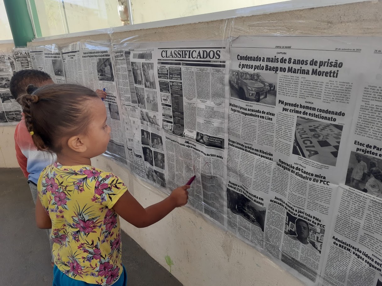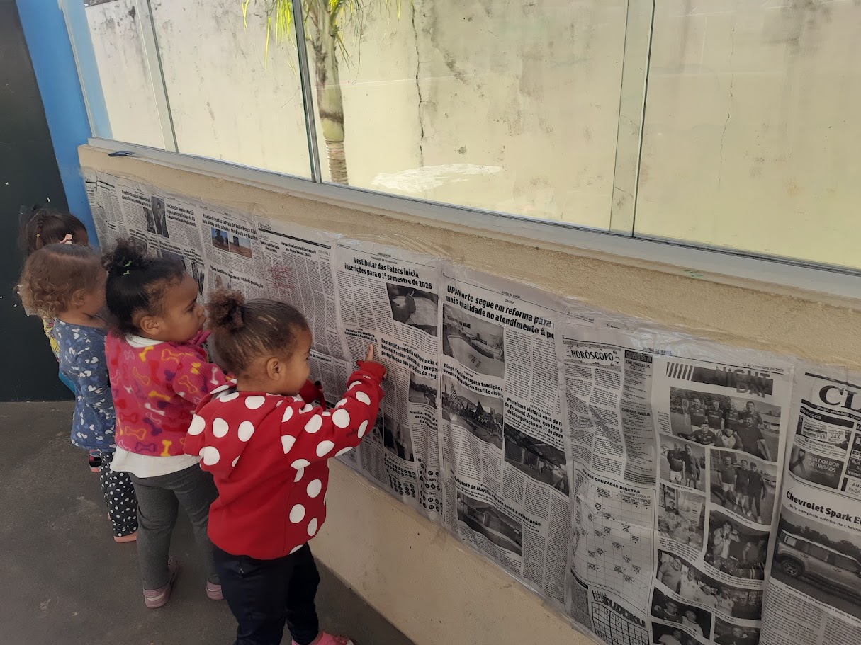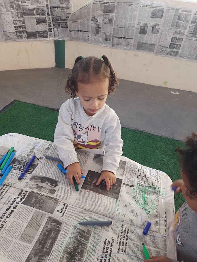 Durante a atividade, as crianças demonstraram grande interesse e iniciativa. Muitas delas se concentraram nas figuras presentes nos jornais, colorindo com traços largos e circulares, enquanto outras exploraram imagens de pessoas e ampliaram a brincadeira ao se observarem no espelho, experimentando registrar suas marcas não apenas nos jornais, mas também nas mãos, nos braços e até no rosto, explorando a