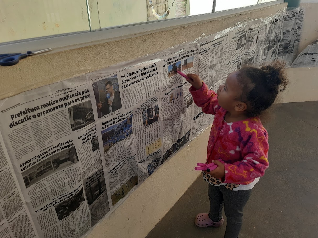 Para promover momentos de exploração gráfica e expressão criativa, organizamos uma vivência para a turma do Nível II utilizando jornais como suporte para o registro de marcas gráficas. O espaço foi preparado de forma a possibilitar que as crianças se sentissem inspiradas a rabiscar livremente movidos pela curiosidade e intenções de deixar suas marcas nas folhas de jornal que foram fixadas sobre as mesas e nas paredes do quiosque, disponibilizamos diversas canetinhas coloridas, permitindo que os pequenos fossem protagonistas na escolha das cores e de onde rabiscar. O ambiente se transformou em um verdadeiro ateliê de descobertas.