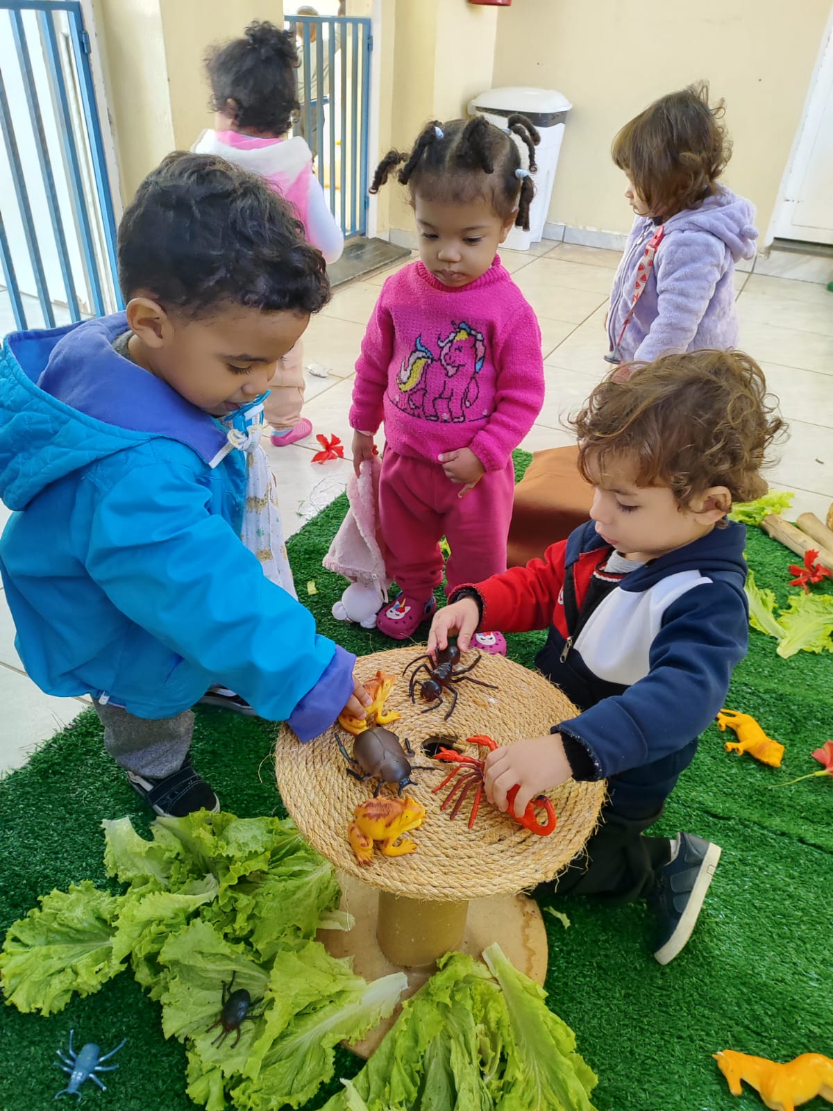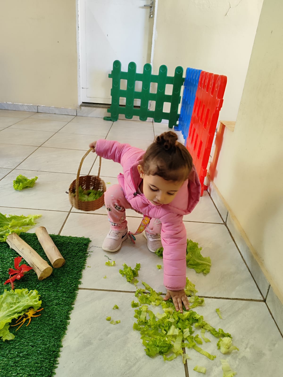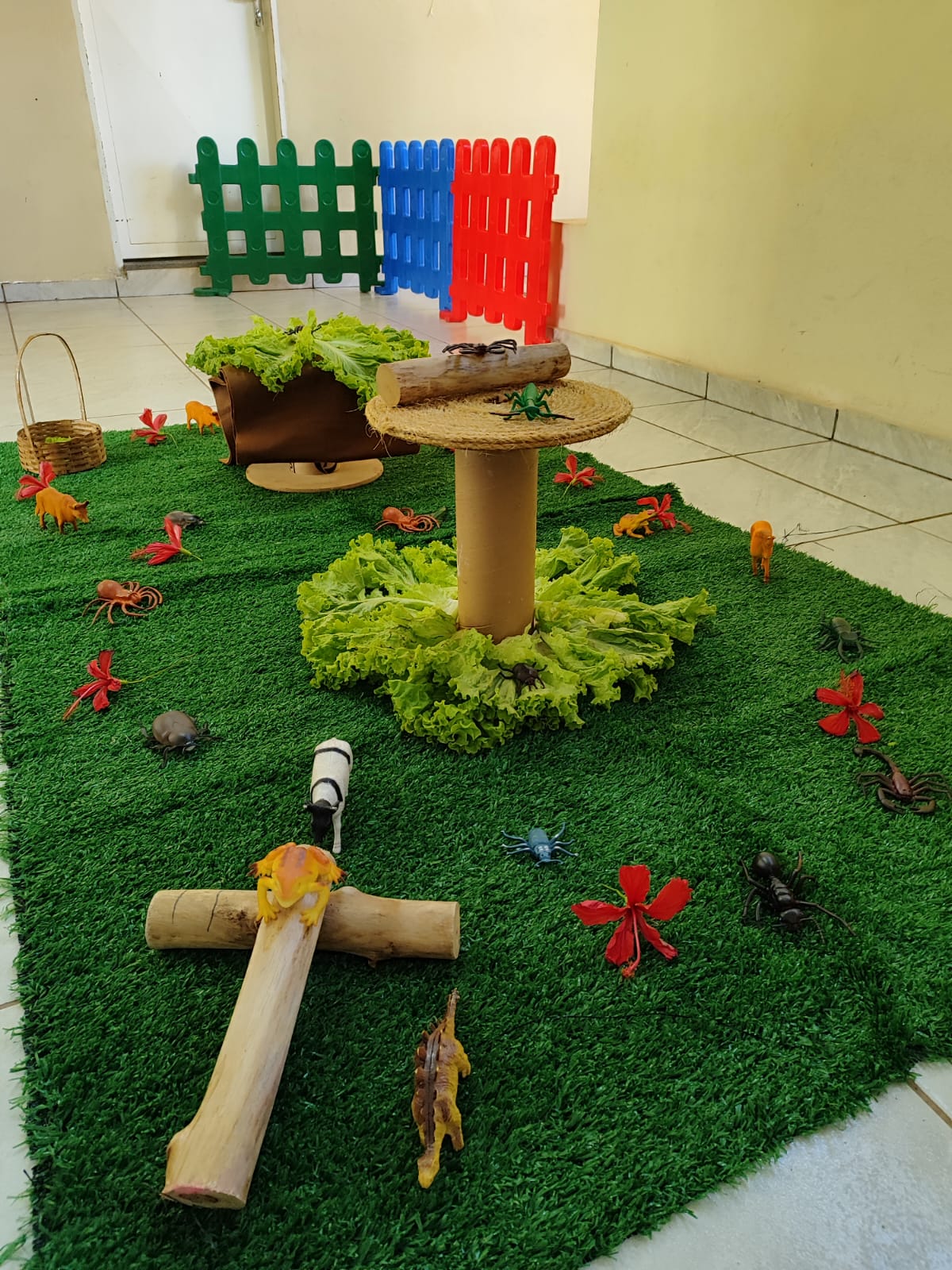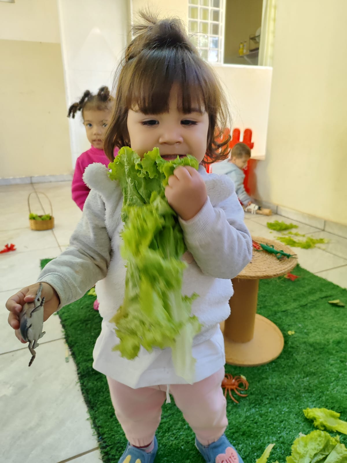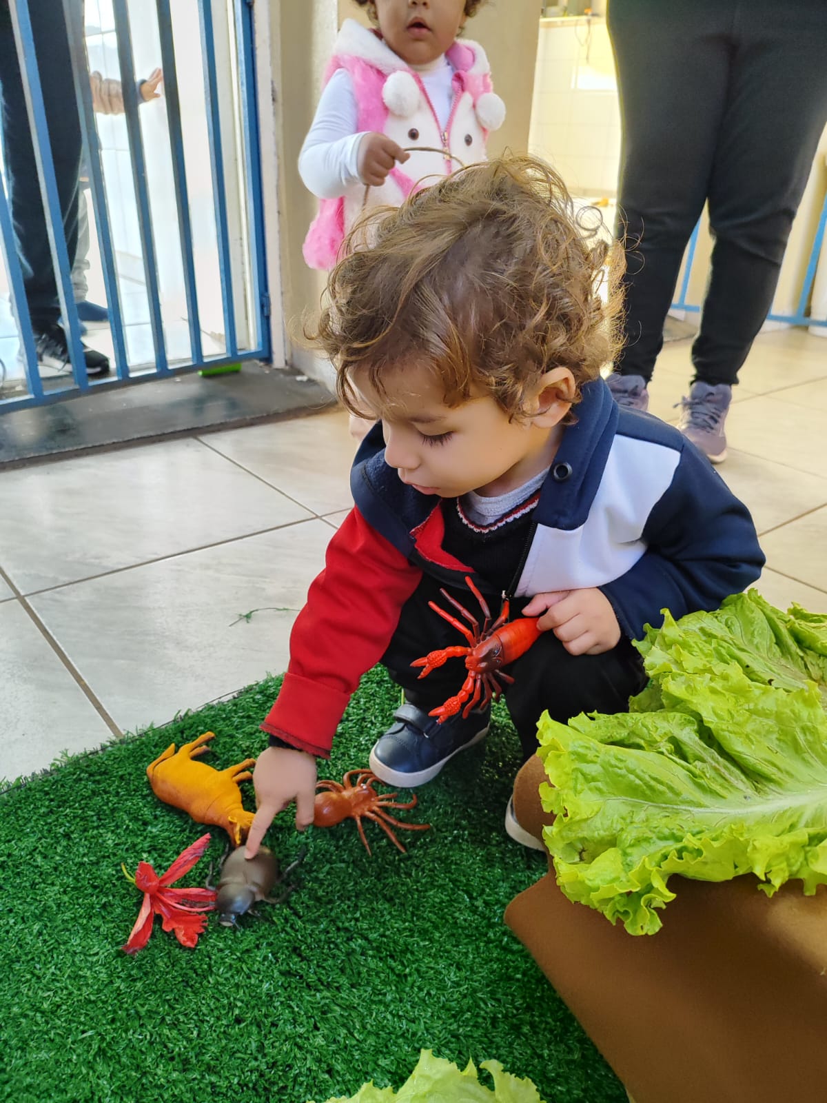 O espaço previamente organizado com verduras, flores e animais de vinil foi um convite à pesquisa. A turma do nível II-A da professora Maiara ao se deparar com a proposta de vivência, se encantou com os elementos ofertados, despertando ainda mais a curiosidade e a vontade de exploração, por meio dos olhares atentos e mãos curiosas que potencializaram as relações e novas investigações.