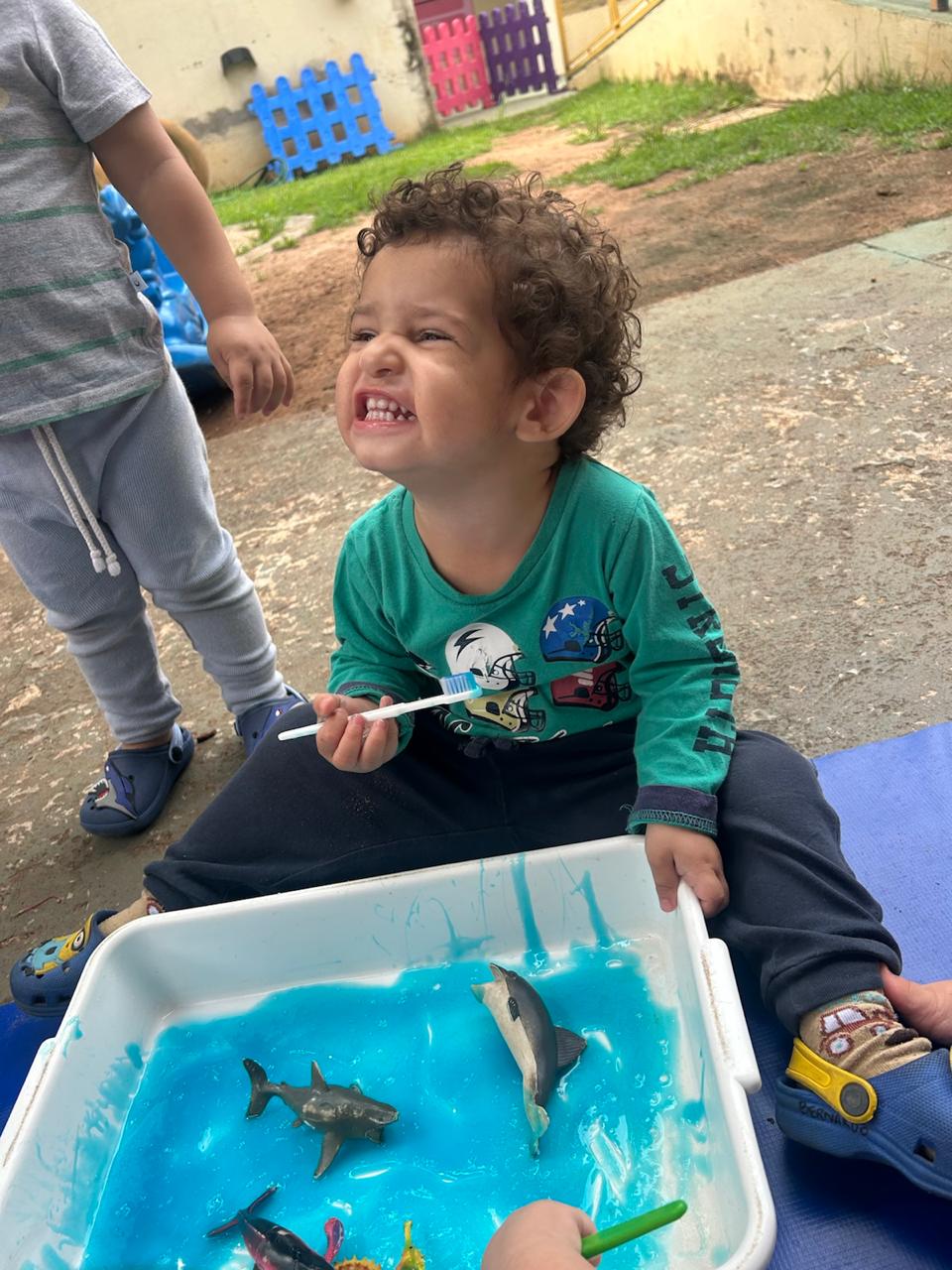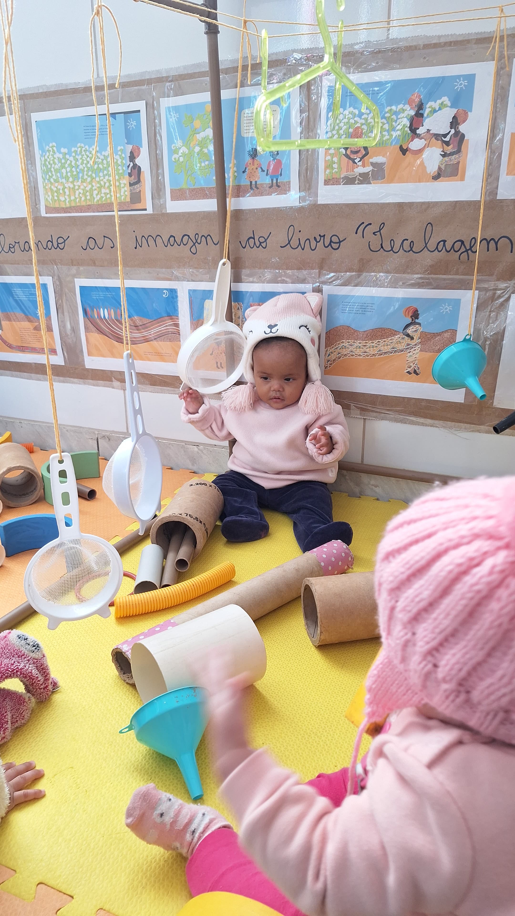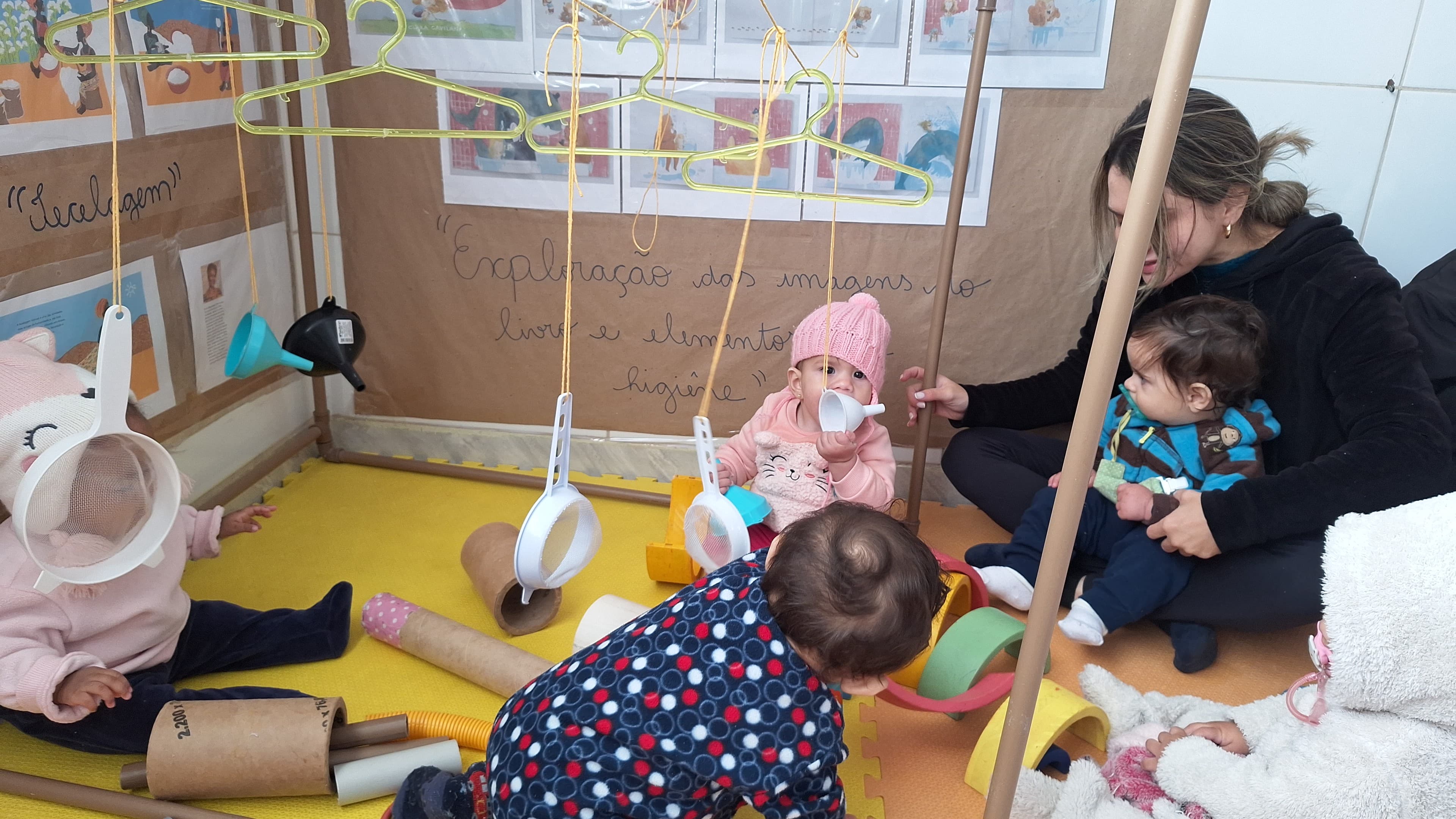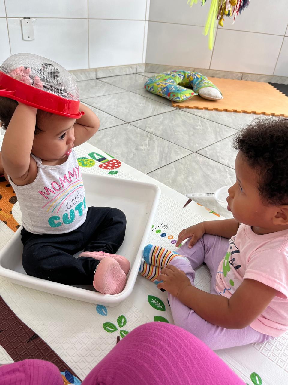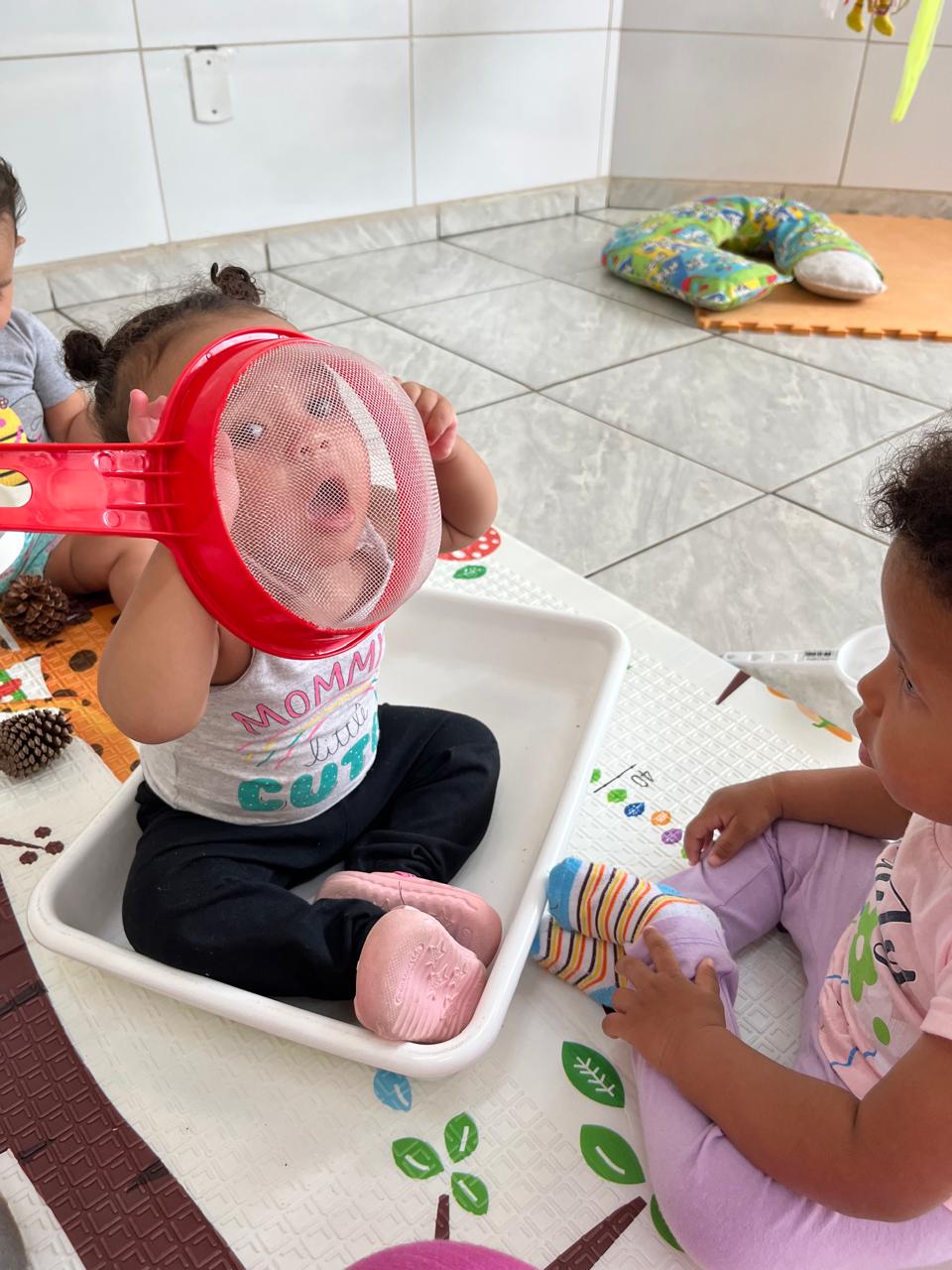 As crianças da turma do Nível I-A da professora Mariana se encantaram com os objetos ofertados na casinha de PVC. Pequenas mãos curiosas exploraram as diversas texturas dos materiais, enquanto olhinhos atentos analisavam e interagiam com os elementos não estruturados. A descoberta foi compartilhada com toda a turma que com dedinhos curiosos tatearam os objetos com as texturas diversas. A experiência foi vivida com grande entusiasmo, com movimentos amplos e manipulação curiosa de cada item. E assim foi um sucesso, visível no brilho dos olhos e na alegria estampada em seus rostinhos!