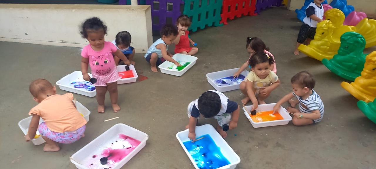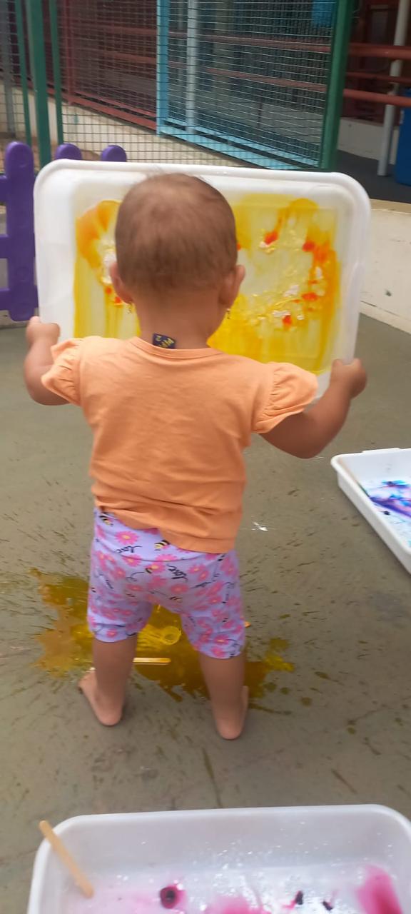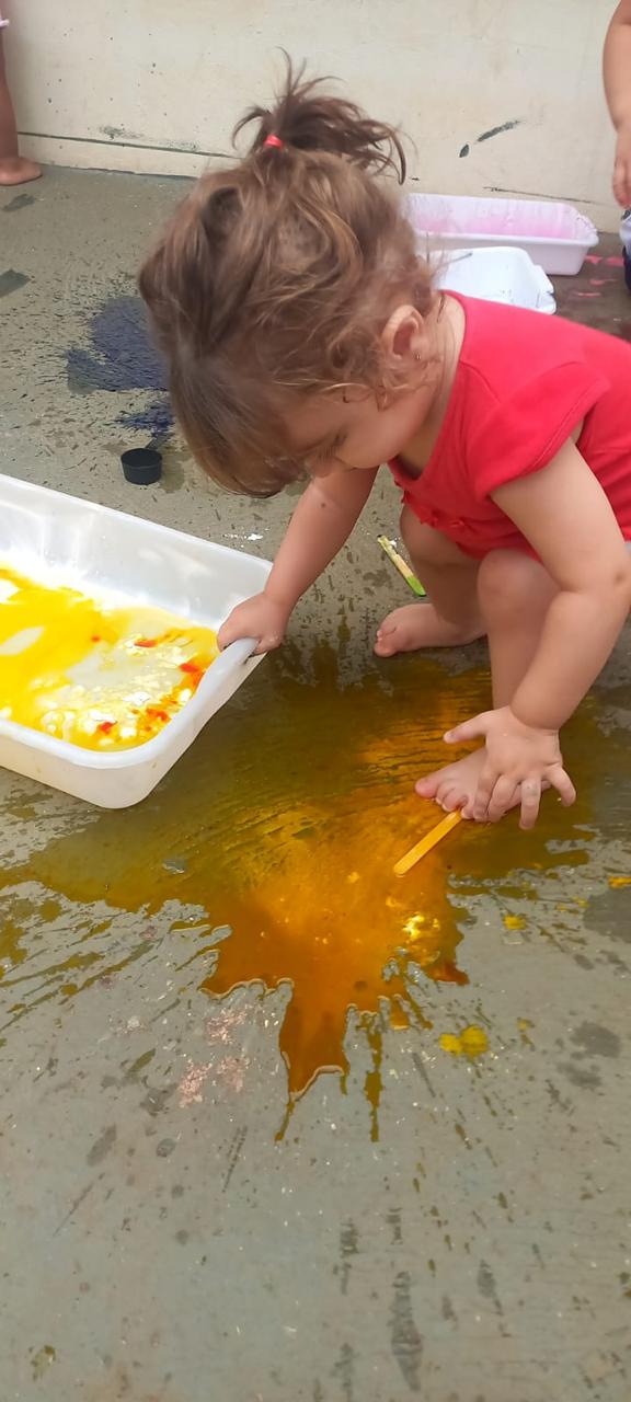 Em uma tarde de sol, as crianças do Nível I - C puderam experienciar gelos feitos com água e corantes alimentícios. Observaram, manipularam, sentiram a temperatura, experimentaram e deixaram suas marcas feitas com o gelo no papel.