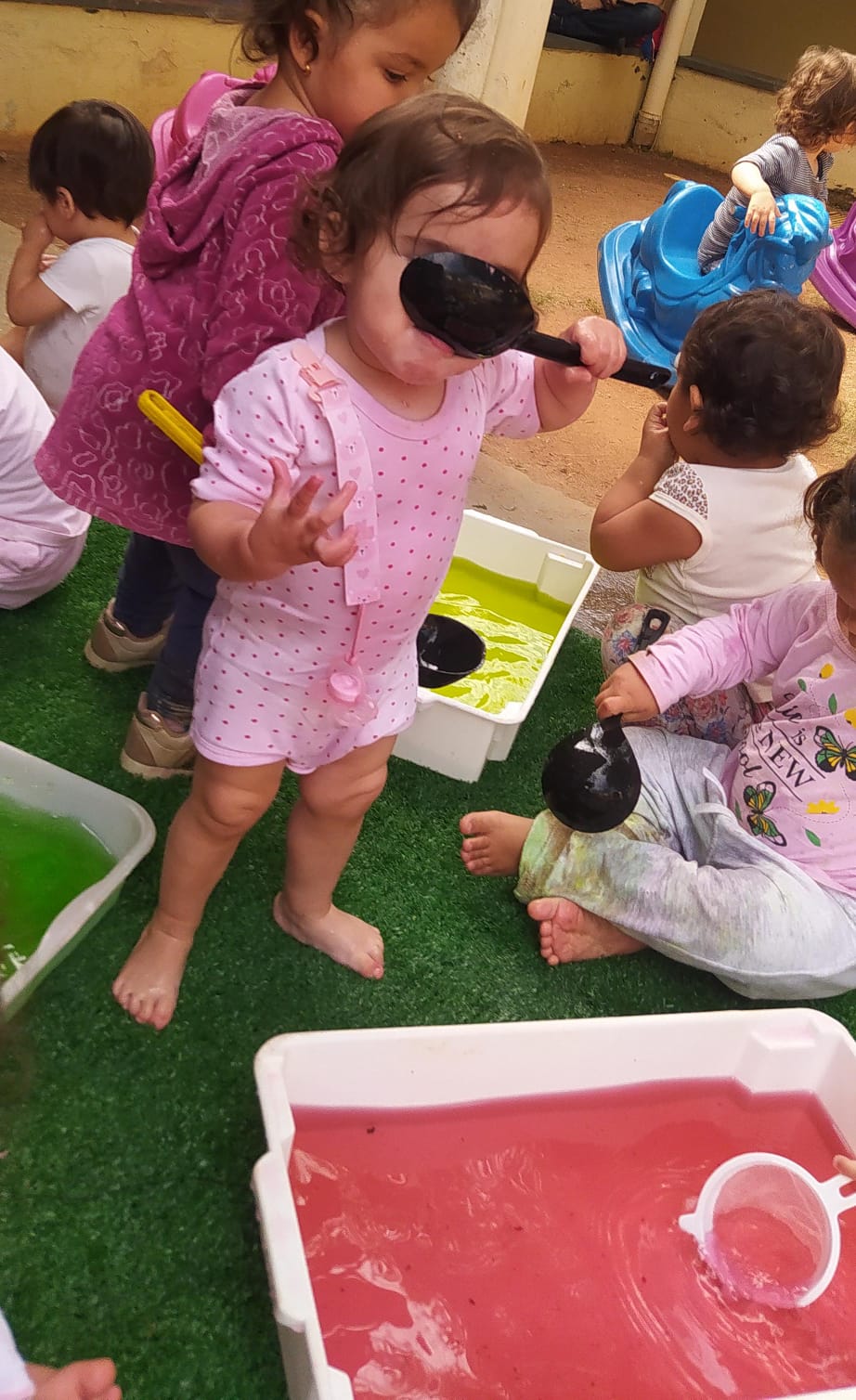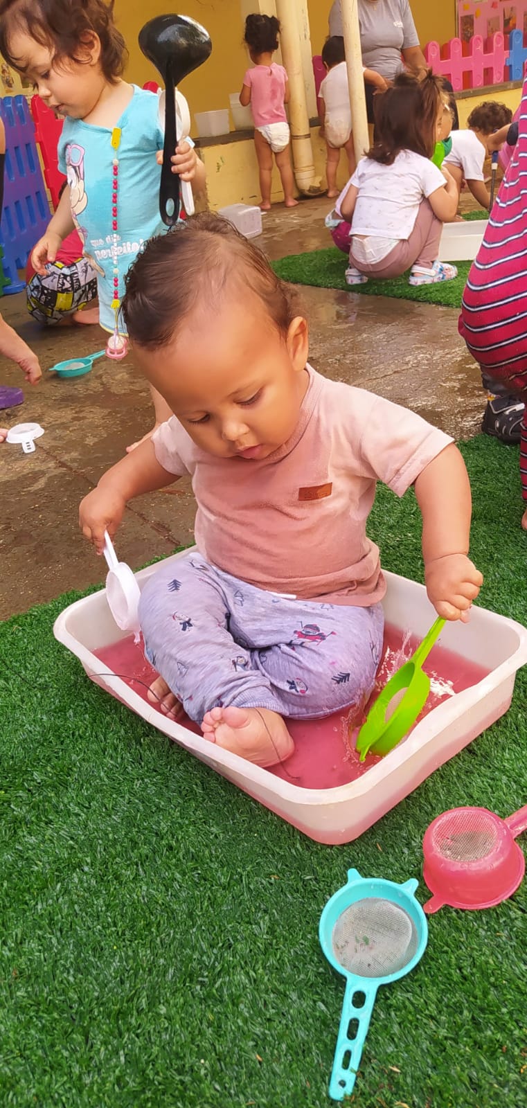 Nesta vivencia, através de um espaço previamente organizado de forma intencional, foi disponibilizado uma bacia cheia de gelatina, como também utensílios de cozinha, despertando a curiosidade dos pequenos e instigando-os a tocar, provar o sabor, brincar e se lambuzar, possibilitando a elas o despertar de diferentes sensações como a de sentir a temperatura, a textura, o cheiro e o gosto desse alimento, ampliando o conhecimento do mundo ao seu redor.