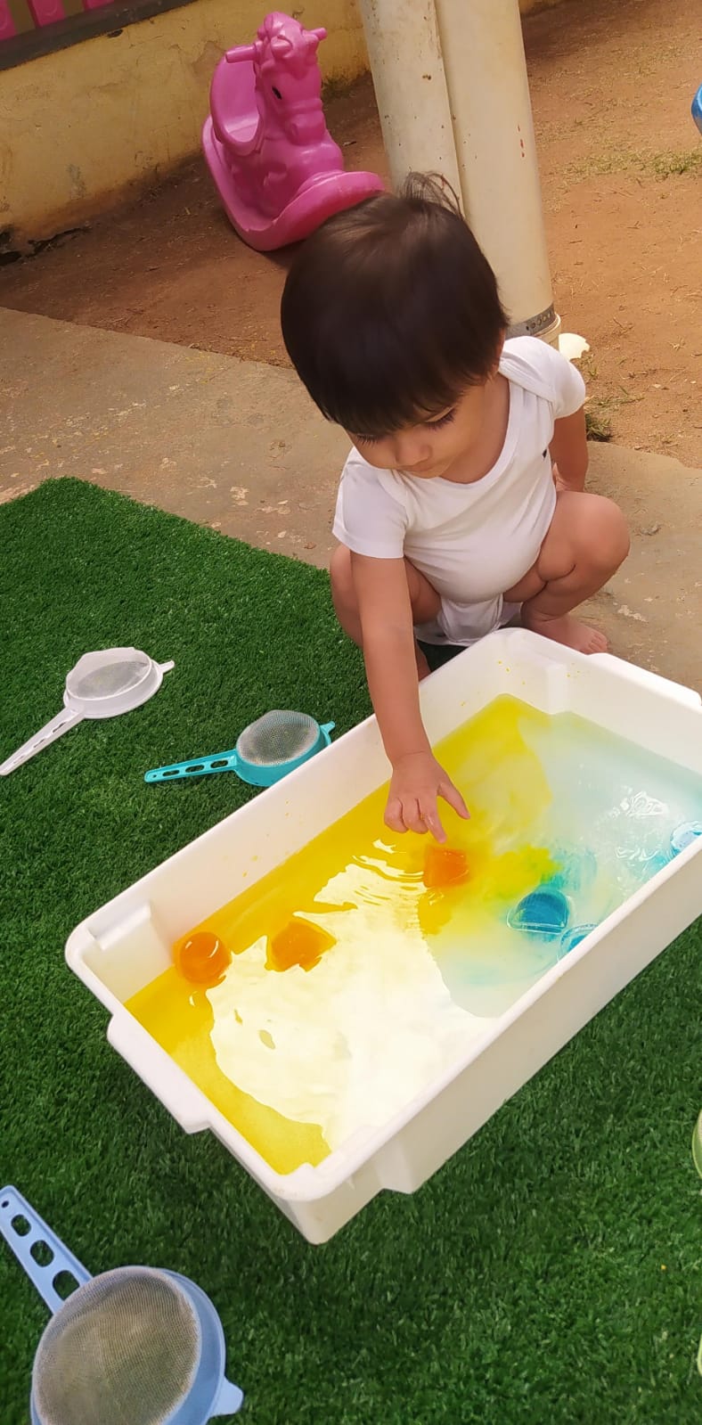Os cubos, feitos com água e corantes, despertaram de imediato o interesse dos pequenos, que se aproximaram curiosos para tocar e explorar. Enquanto manuseavam os gelos e tentavam pescá-los com conchas e peneiras, as crianças perceberam a temperatura fria, a textura lisa e escorregadia do gelo, observando também as cores se misturando na água e o gelo derretendo lentamente. A experiência foi repleta de descobertas, expressões de surpresa, risadas e encantamento, envolvendo o corpo, os sentidos e a imaginação em um momento de muita alegria e aprendizado.