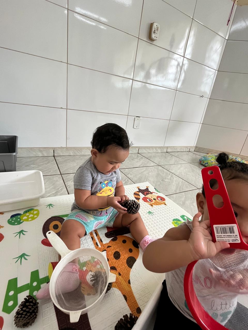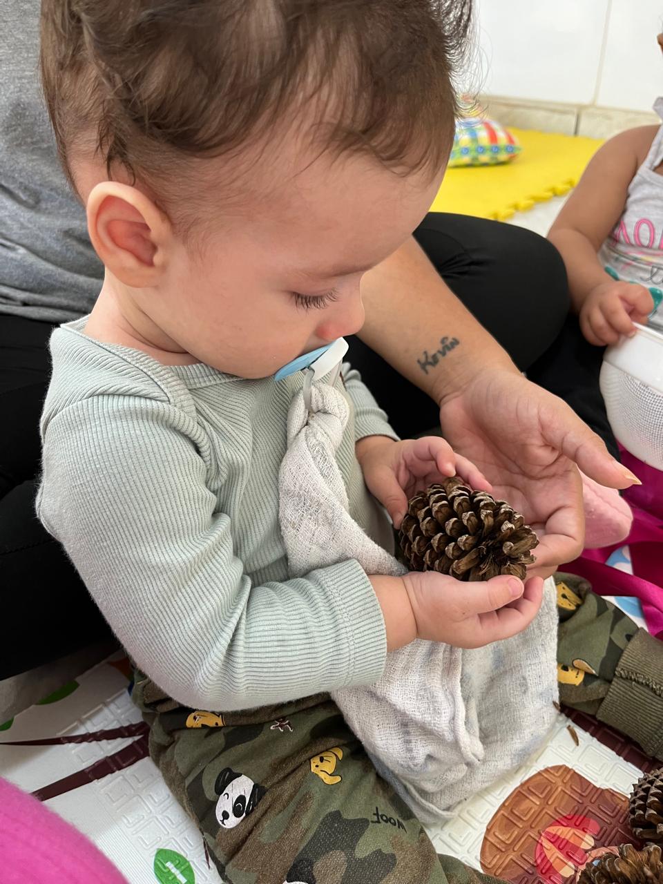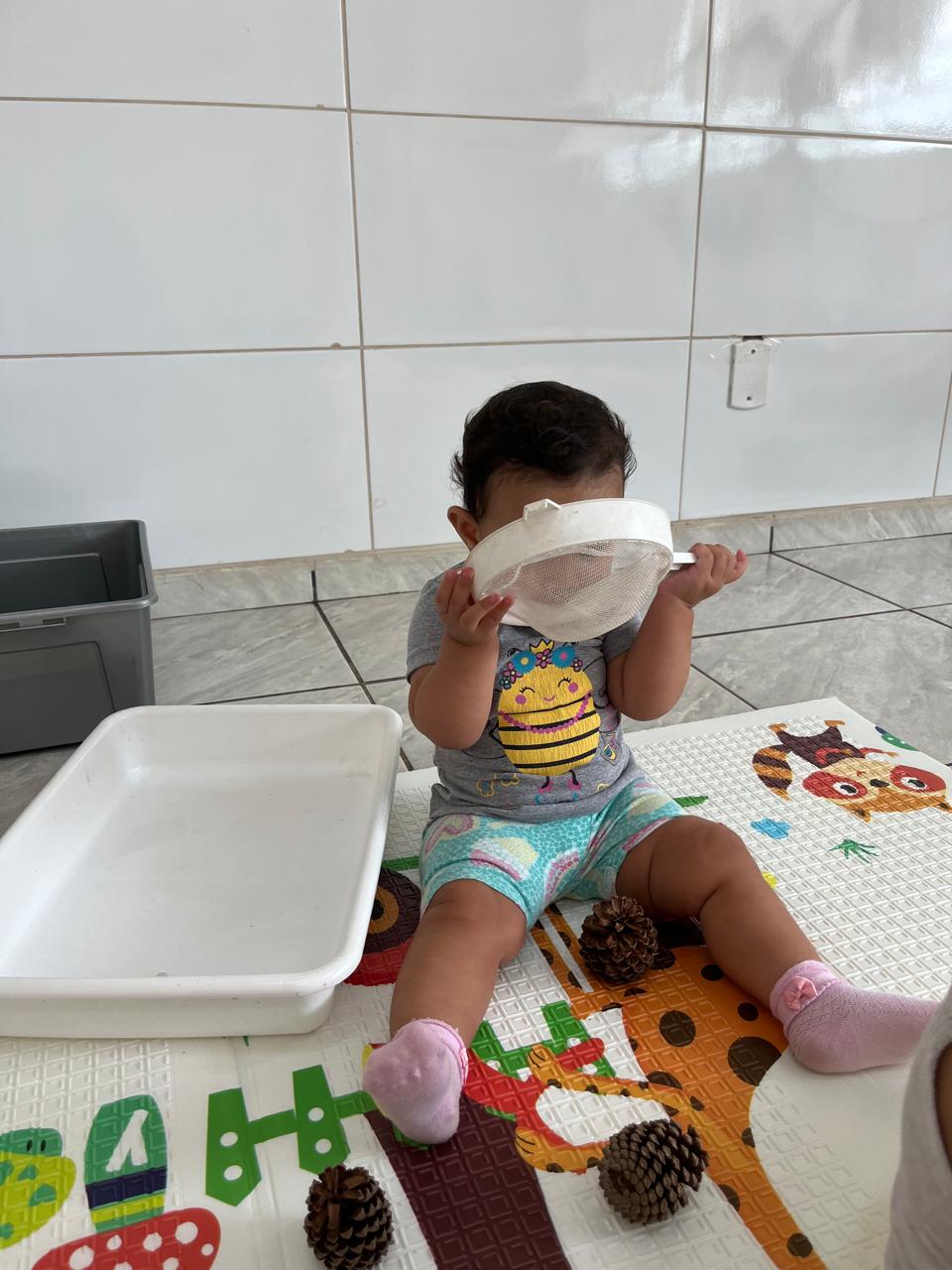 A investigação dos bebês da turma de Nível I-A (4 meses a 1 ano) mediada pela professora Ana Letícia e educadoras: Solange e Emily com elementos da natureza, por meio da manipulação de peneiras e pinhas, constituiu-se como uma experiência rica em descobertas e experimentações. A vivência possibilitou a exploração de texturas e movimentos, incentivando ações como colocar, retirar e manipular os materiais, promovendo descobertas sensoriais de forma livre e investigativa. Nesse contexto, os bebês foram convidados a agir ativamente sobre os objetos, observando suas propriedades, produzindo sons, percebendo diferenças e estabelecendo relações, o que favorece o desenvolvimento da curiosidade, e da construção de conhecimentos a partir da interação com o meio natural.