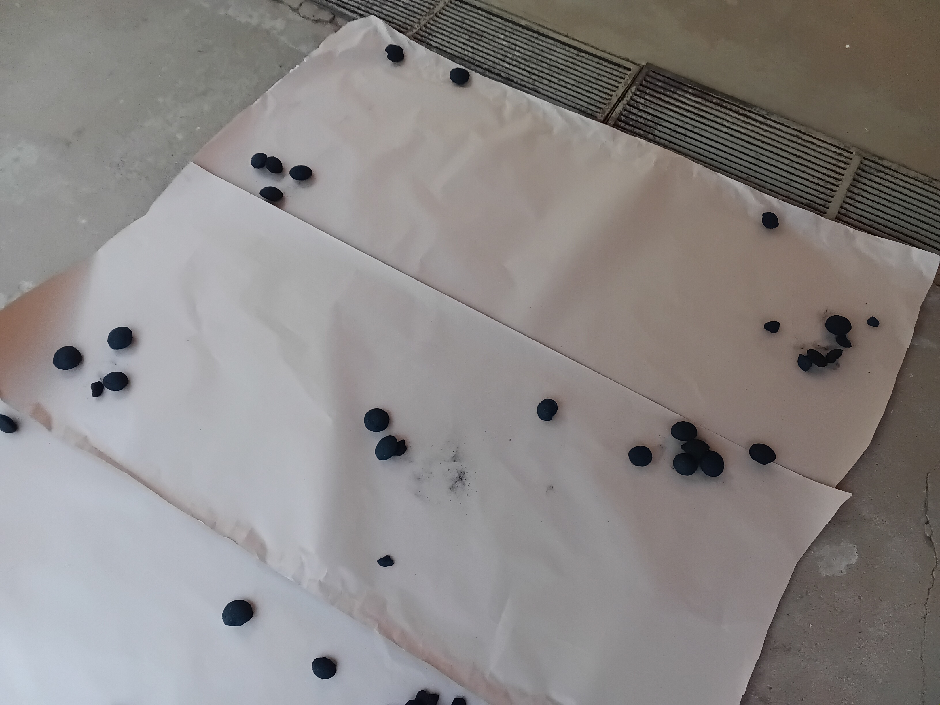 Organizei intencionalmente o espaço projetando a sombra dos dinossauros utilizando farinha e açafrão, com a peneira, em cima do.papel camurça preto e azul.