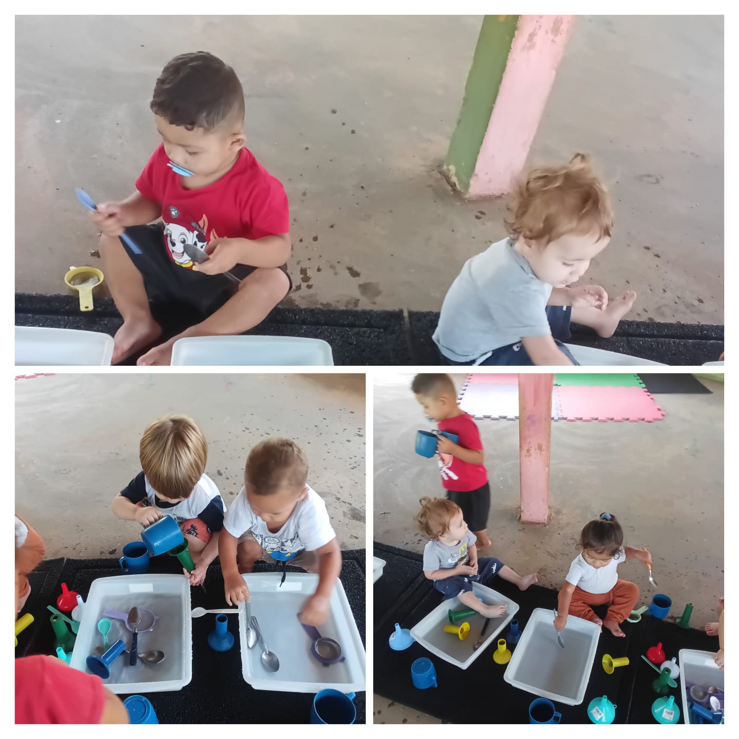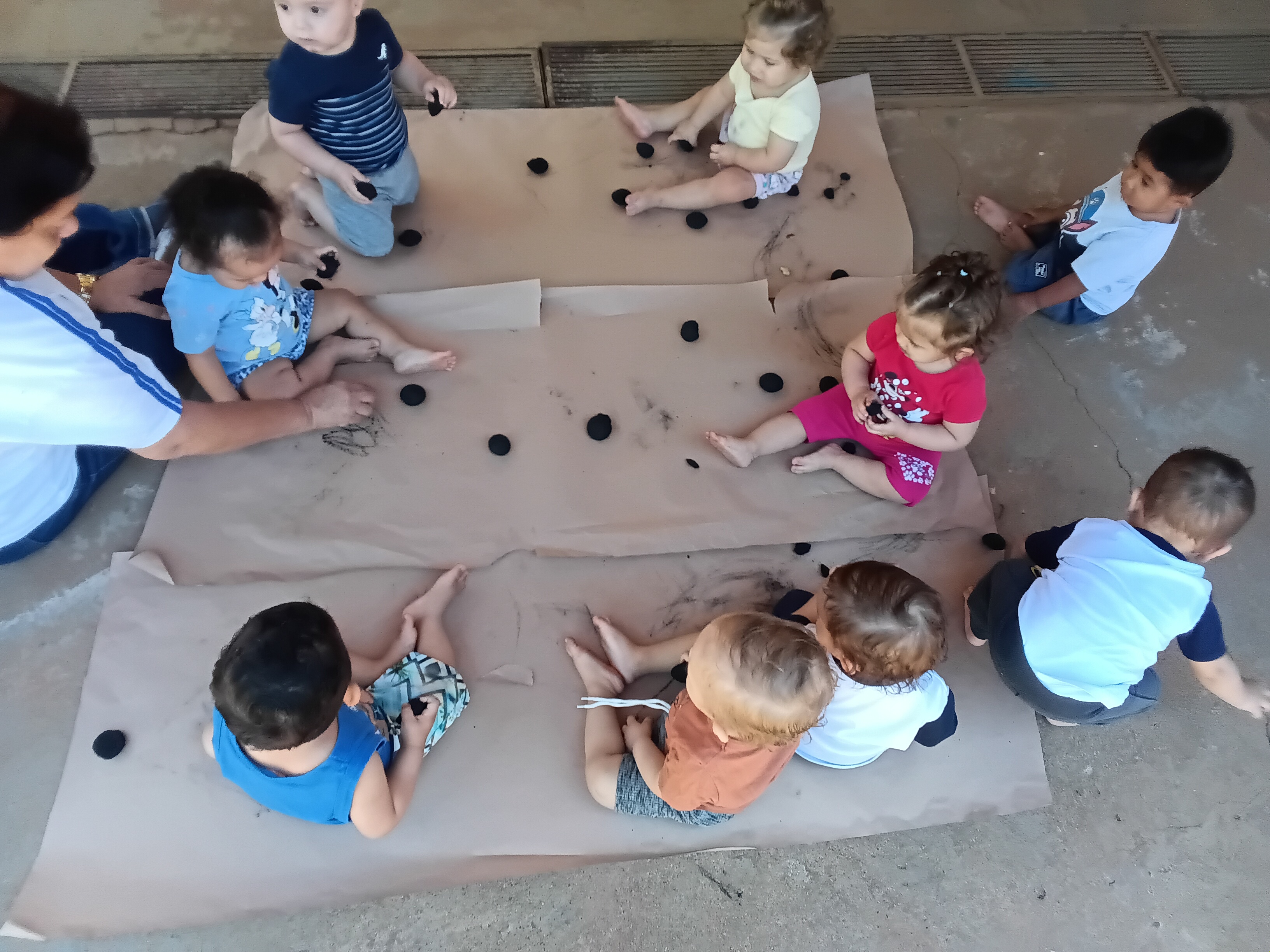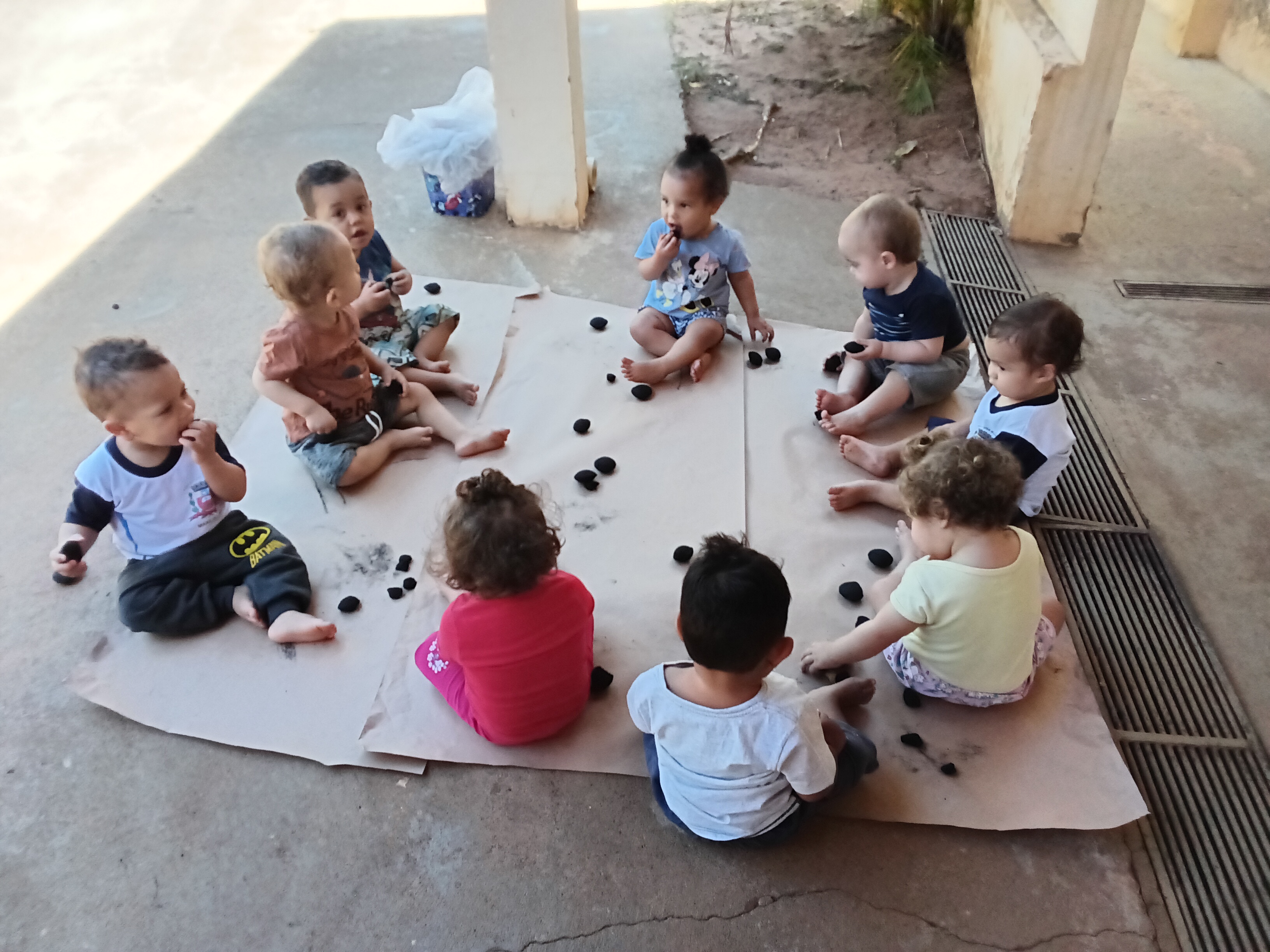 As crianças da turma do nível 1A, sob a liderança e planejamento da professora Suyan e auxílio das educadoras Adriele e Lauani, vivenciam experiências que vão ao encontro com a atividade principal do desenvolvimento nesta etapa. Assim, os elementos da natureza, a exploração de sons, cheiros, texturas, pesos, as conversas e as possibilidades de exploração da rua e seu movimento, podem favorecer o desenvolvimento da comunicação emocional, dos vínculos afetivos e das descobertas por meio da exploração.