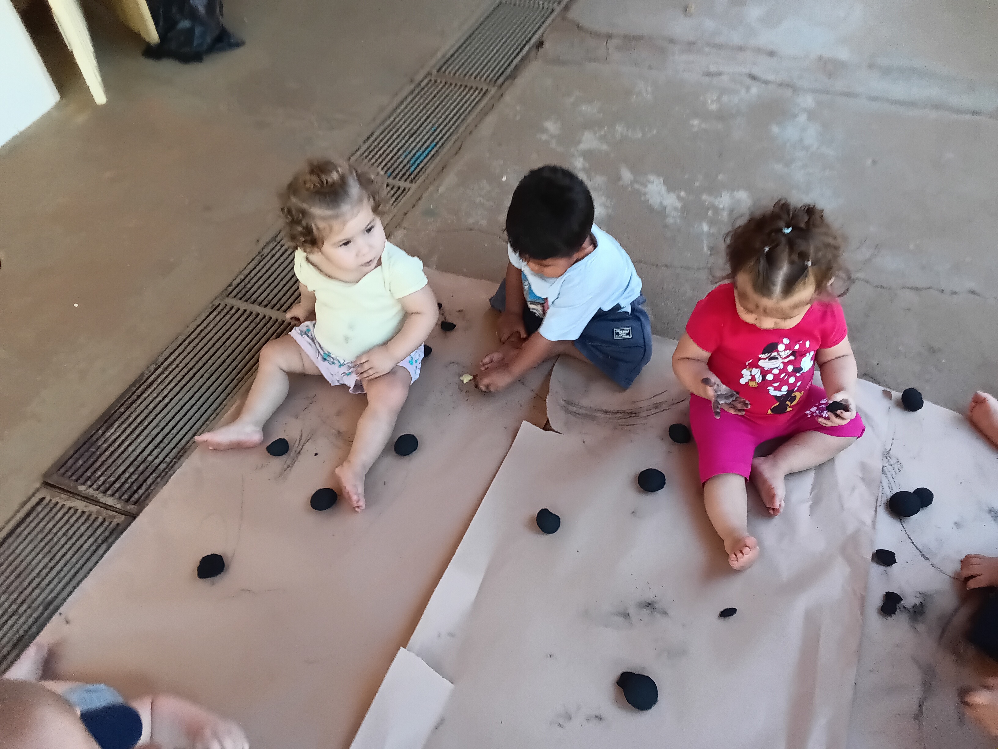 A turma do NI B, da professora Márcia e das educadoras Solange e Regiane, vivenciou um momento de descobertas com o carvão sobre o papel craft. As crianças, ao encontrarem os pedaços de carvão, olharam com curiosidade e logo iniciaram suas experimentações com esse potente material riscante. Além de registrarem suas marcas gráficas no papel, puderam explorar a textura, a dureza e a cor deixada pelo carvão no papel e também em suas pequenas mãozinhas. Foi um momento marcado pela concentração, pela curiosidade e pela rica expressão artística desses pequenos.