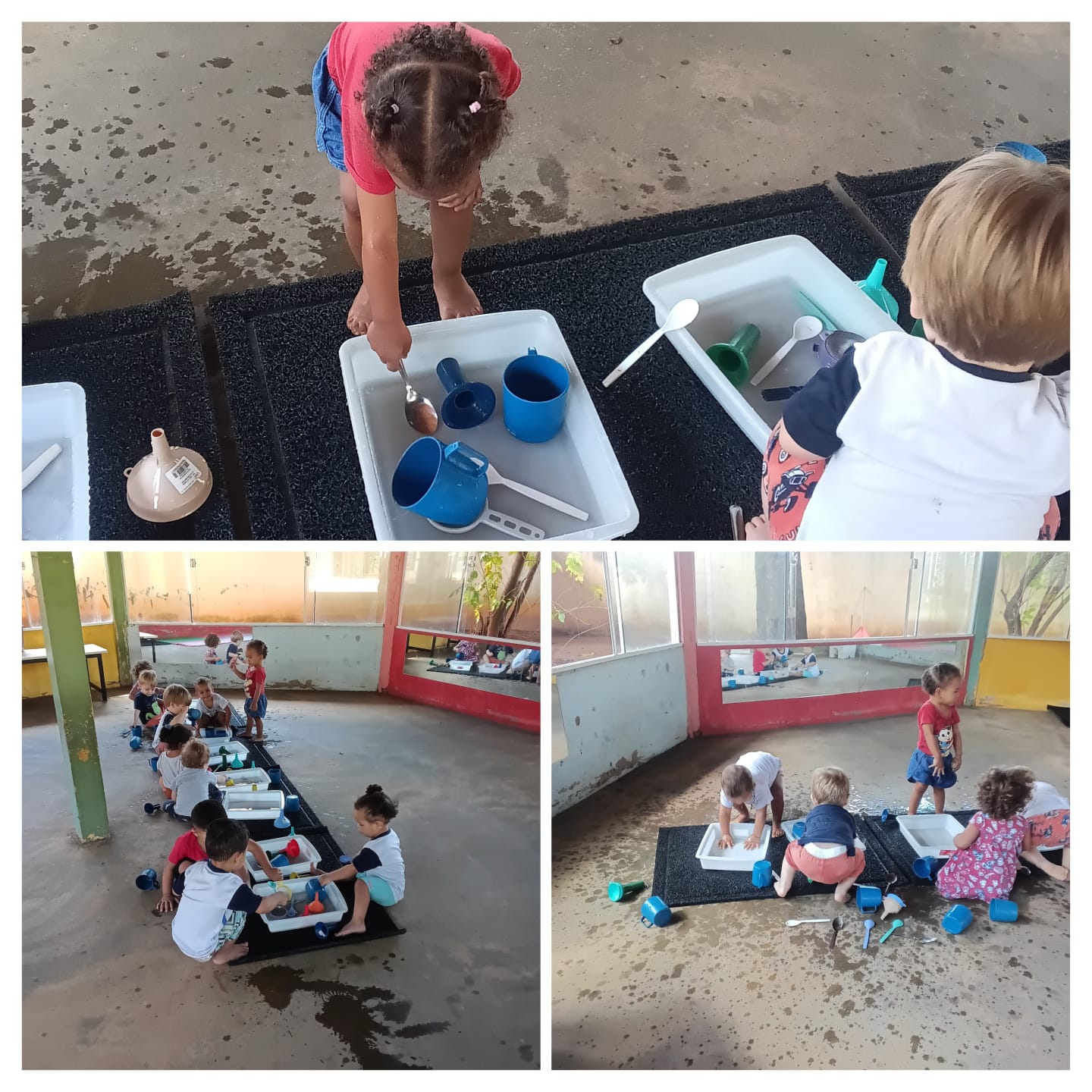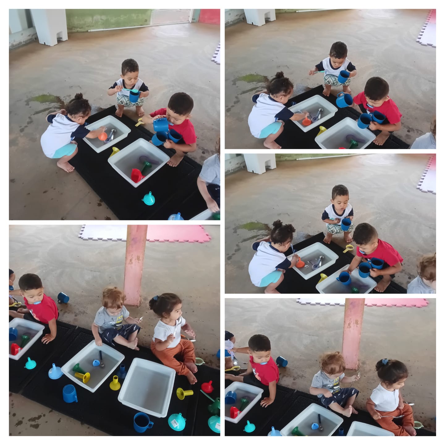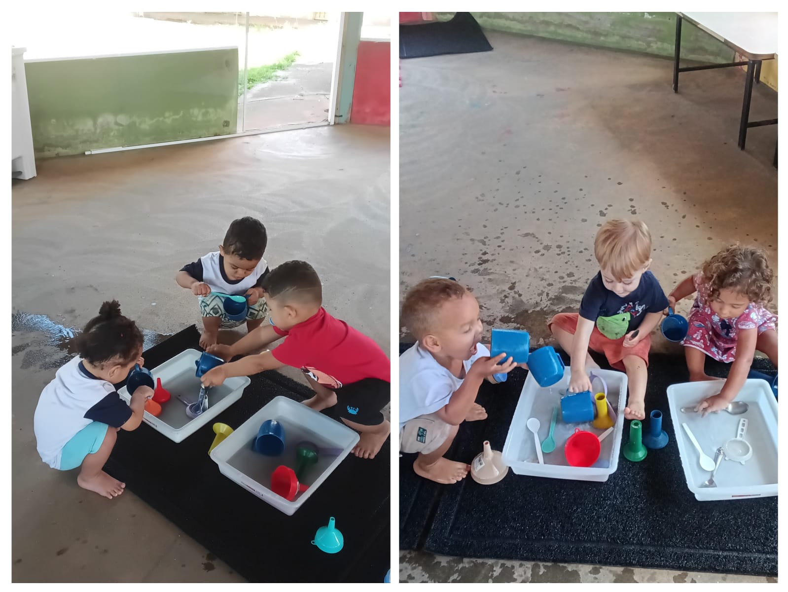 Durante a vivência, as crianças não apenas realizaram ações motoras, mas envolveram-se em processos de apropriação das qualidades dos objetos. Ao transferir a água ou observar o fluxo pelo funil, elas internalizaram relações de causa e efeito, mediadas pela linguagem e pela observação dos pares. Essas interações sociais foram fundamentais para a formação das funções psicológicas superiores, permitindo que as crianças ampliassem sua capacidade de agir de forma deliberada sobre o meio, transformando a experimentação sensorial em um rico processo de desenvolvimento das funções psicológicas superiores.