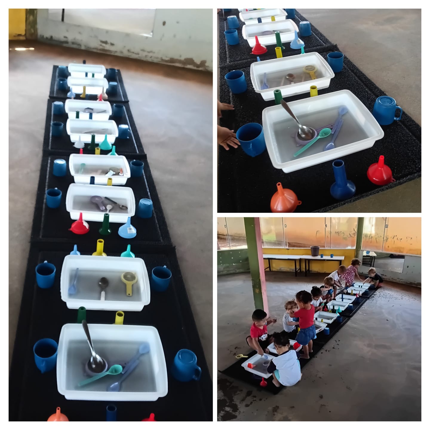 A turma do NÍVEL 2 vivenciou um contexto investigativo, envolvendo o elemento água e diversos instrumentos mediadores, como: bandejas, funis, canecas, colheres, peneiras e carretéis. Mais do que simples objetos de apoio, esses elementos foram apresentados como ferramentas culturais que desafiaram as crianças a superar suas percepções imediatas. O espaço, intencionalmente organizado, constituiu uma Zona de Desenvolvimento Proximal, onde a curiosidade individual se transformou em busca por novos conhecimentos.