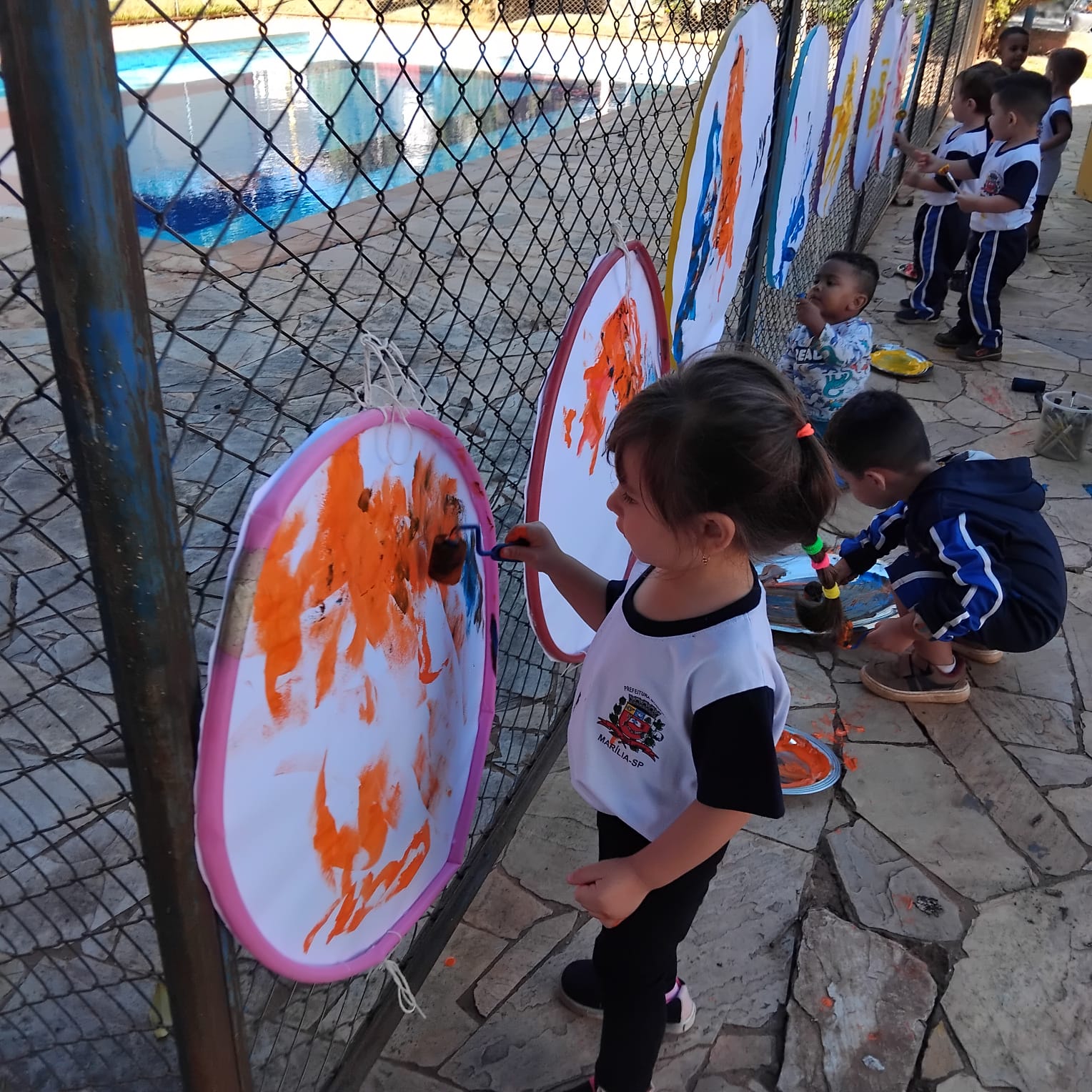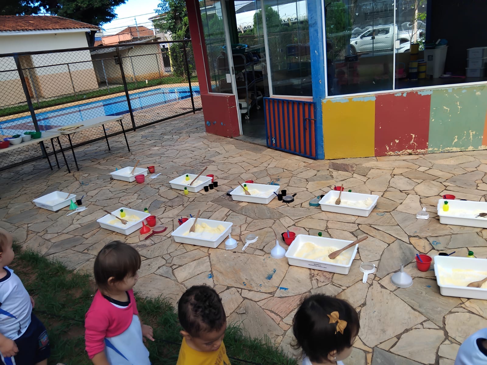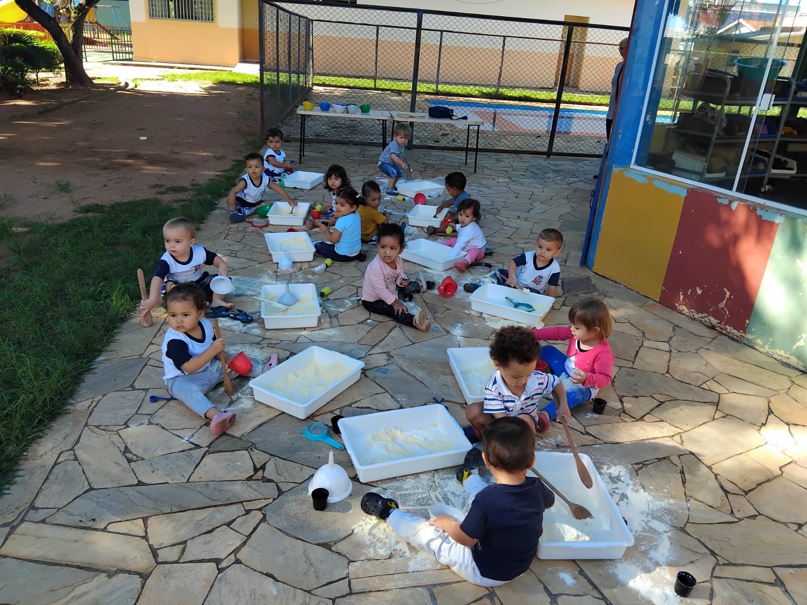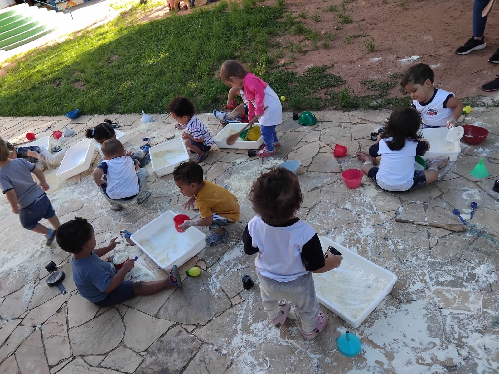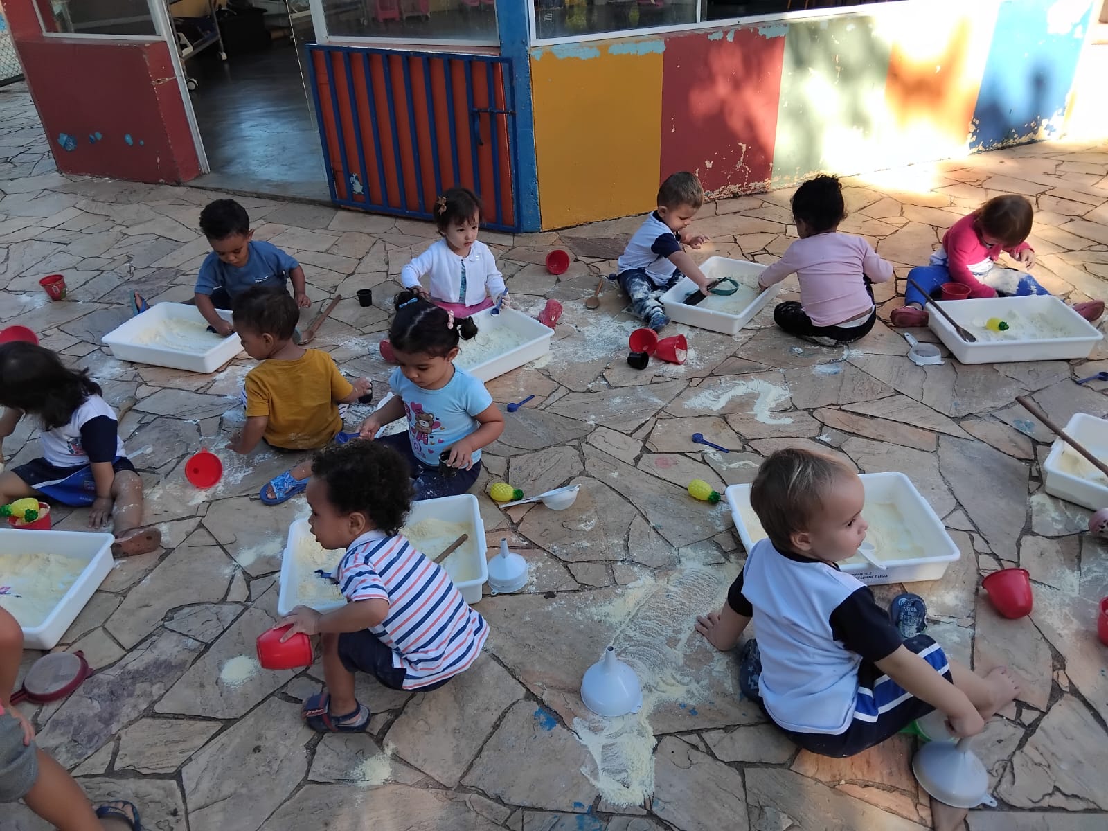 Foram disponibilizados: objetos do cotidiano que aguçaram a pesquisa (como funil, peneira, escumadeira, etc.); materiais contáveis ( ou seja, que podemos contar, como macarrão e os elementos da natureza); materiais não contáveis (fubá, farinha de trigo, quirela que proporcionam, além das descobertas sensoriais, várias investigações). Na Emei Príncipe Mikasa as crianças aprendem e se desenvolvem nos diferentes espaços educativos da escola.