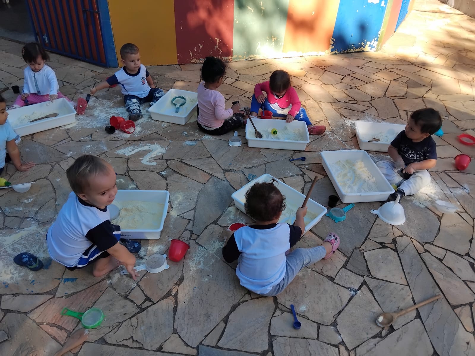Durante a atividade, os pequenos exploraram livremente, manipulando, transferindo, peneirando e observando as diferentes texturas. A proposta favoreceu experiências sensoriais ricas, incentivando a investigação, a criatividade e a construção de conhecimentos de forma lúdica e significativa.