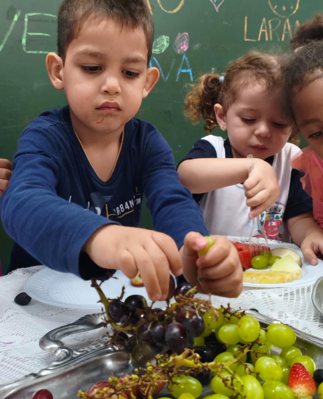 A turma do Infantil II A, da professora Jaqueline, participou da “7ª Jornada de Educação Alimentar e Nutricional”, desenvolvendo propostas sobre alimentação saudável numa parceria da equipe escolar com profissionais da saúde do município. No dia 21/08, as crianças realizaram uma aula-passeio a uma propriedade rural vinculada à Coagifram (Cooperativa de Agricultura Familiar), fornecedora de hortaliças para a merenda escolar. Nesse encontro com a terra e com quem dela cuida, vivenciaram experiências significativas, explorando o plantio e a colheita e conhecendo de perto de onde vem alguns alimentos que chegam às suas mesas. Em continuidade, no dia 04/09, participaram de uma tarde especial com as nutricionistas Laena e Thalita, em que o lanche se tornou oportunidade de aprendizado. Cada criança montou seu lanche de acordo com suas escolhas, experimentando novos sabores e compreendendo, de forma prática e prazerosa, a importância dos alimentos para a saúde. Essas ações conjuntas entre escola e profissionais da saúde possibilitaram experiências ricas em descobertas, em que a curiosidade se transformou em aprendizado e a vivência coletiva fortaleceu vínculos, saberes e sentidos, contribuindo para a formação de hábitos conscientes desde cedo.