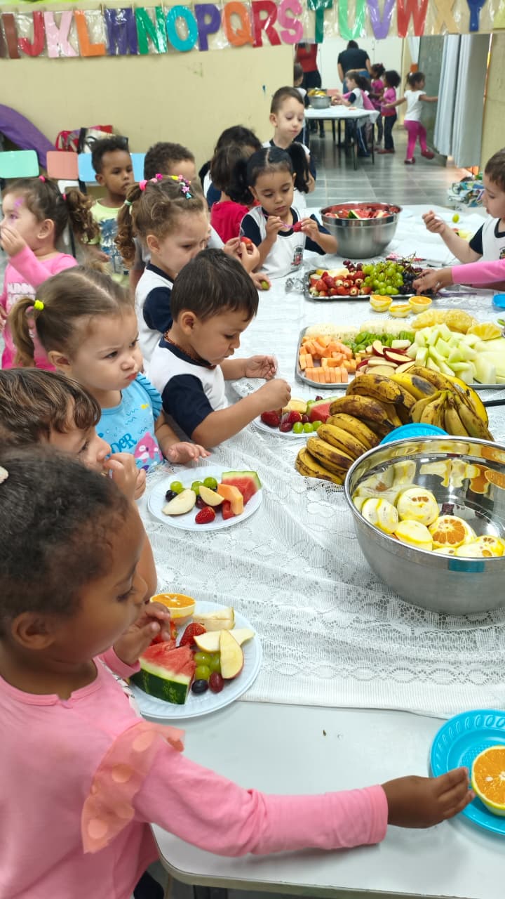 De 20 e 26 de outubro de 2025, tivemos uma semana repleta de cores, aromas e sabores: a Semana da Alimentação Saudável. Organizada pelas Secretarias Municipais da Saúde e da Educação, essa ação aproximou escola, crianças e famílias em torno de um mesmo propósito — cuidar do corpo e da mente por meio de escolhas cheias de vida e afeto. Durante toda a semana, o clima foi de alegria e descobertas. As crianças se envolveram em diferentes vivências, explorando cores, sabores e texturas, cada momento partilhado transformou-se em um convite à investigação, à descoberta e ao encantamento. Entre as experiências, destacou-se uma deliciosa mesa de experimentação, repleta de frutas frescas, e a preparação de sucos naturais pelas próprias crianças, além de outras propostas que envolveram o grupo em um clima de curiosidade e alegria. Contamos ainda com a presença da equipe da USF Vila Hípica, que contribuiu com valiosos conhecimentos sobre escolhas alimentares conscientes e o cuidado com a saúde. Foi uma semana repleta de cores, aromas e gestos que alimentaram o corpo e o coração. Porque educar também é cuidar, e uma educação de qualidade nasce do amor e do cuidado em cada detalhe.