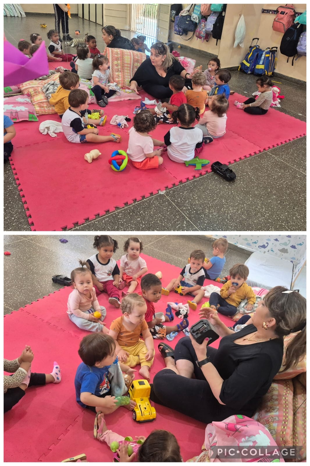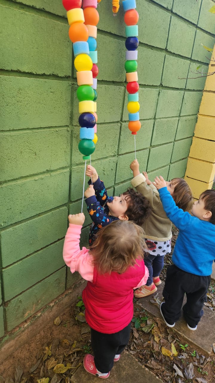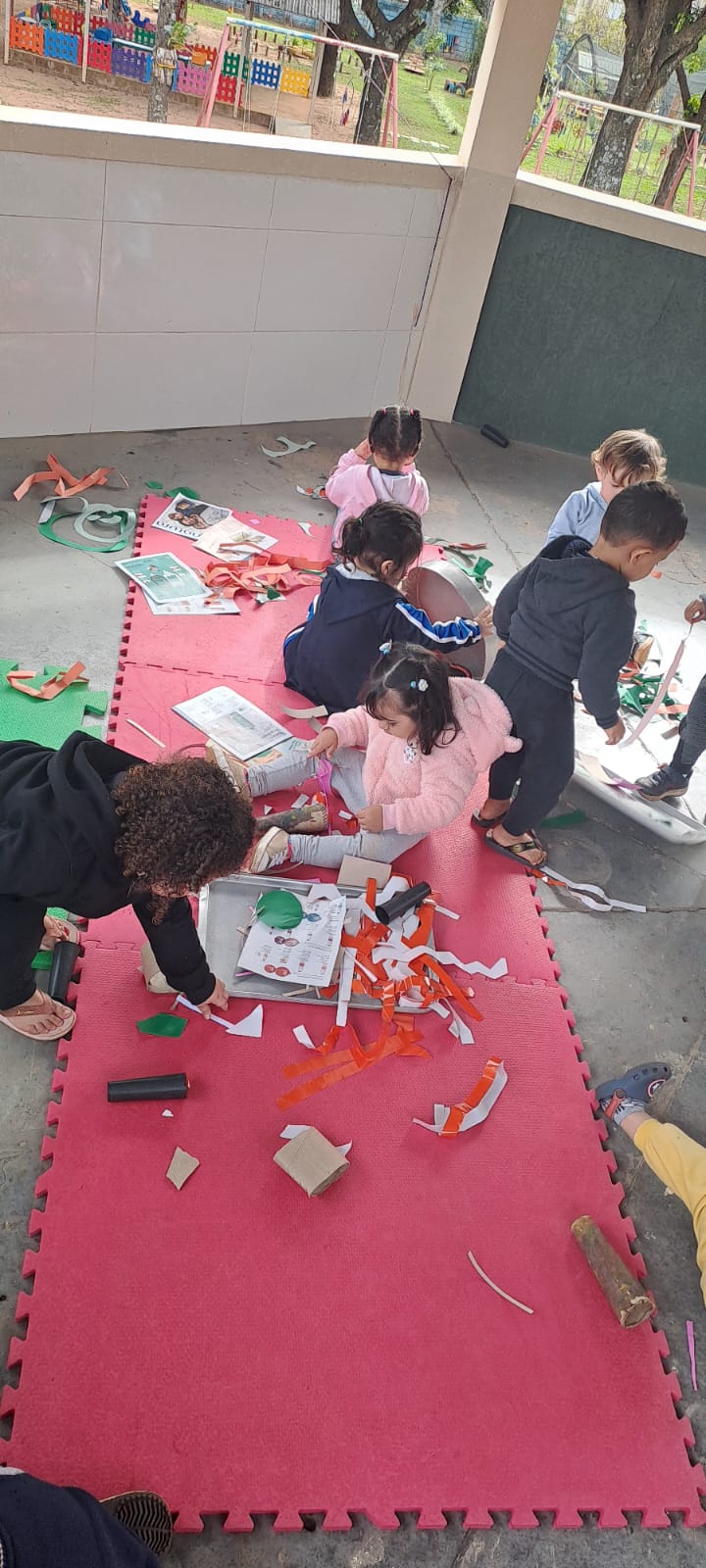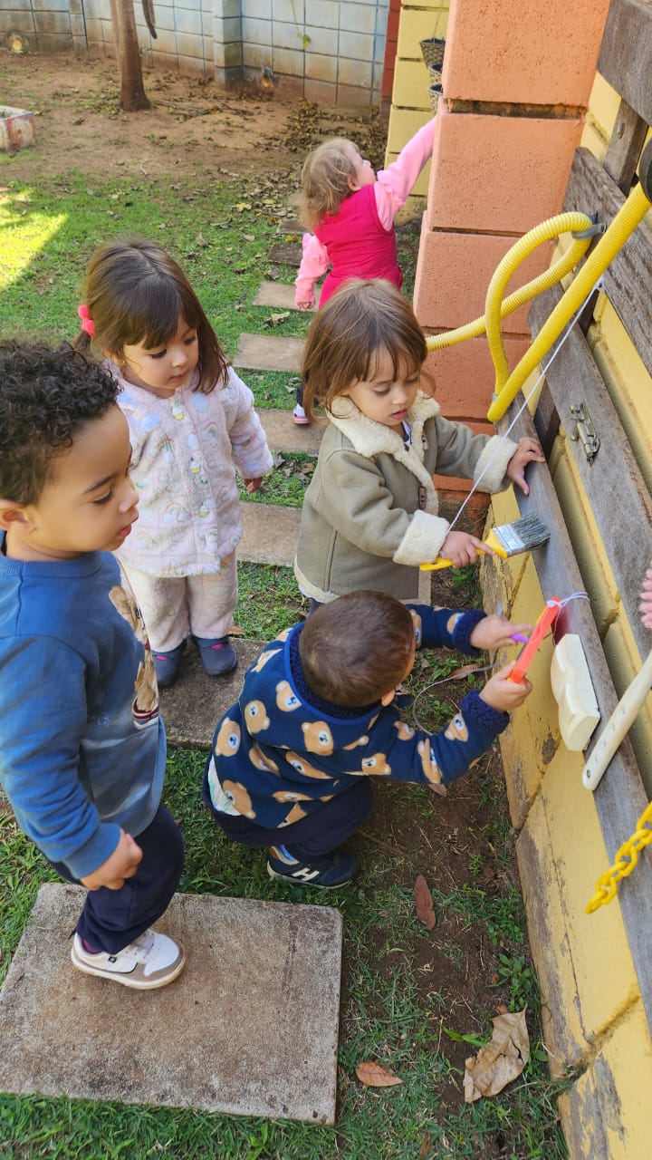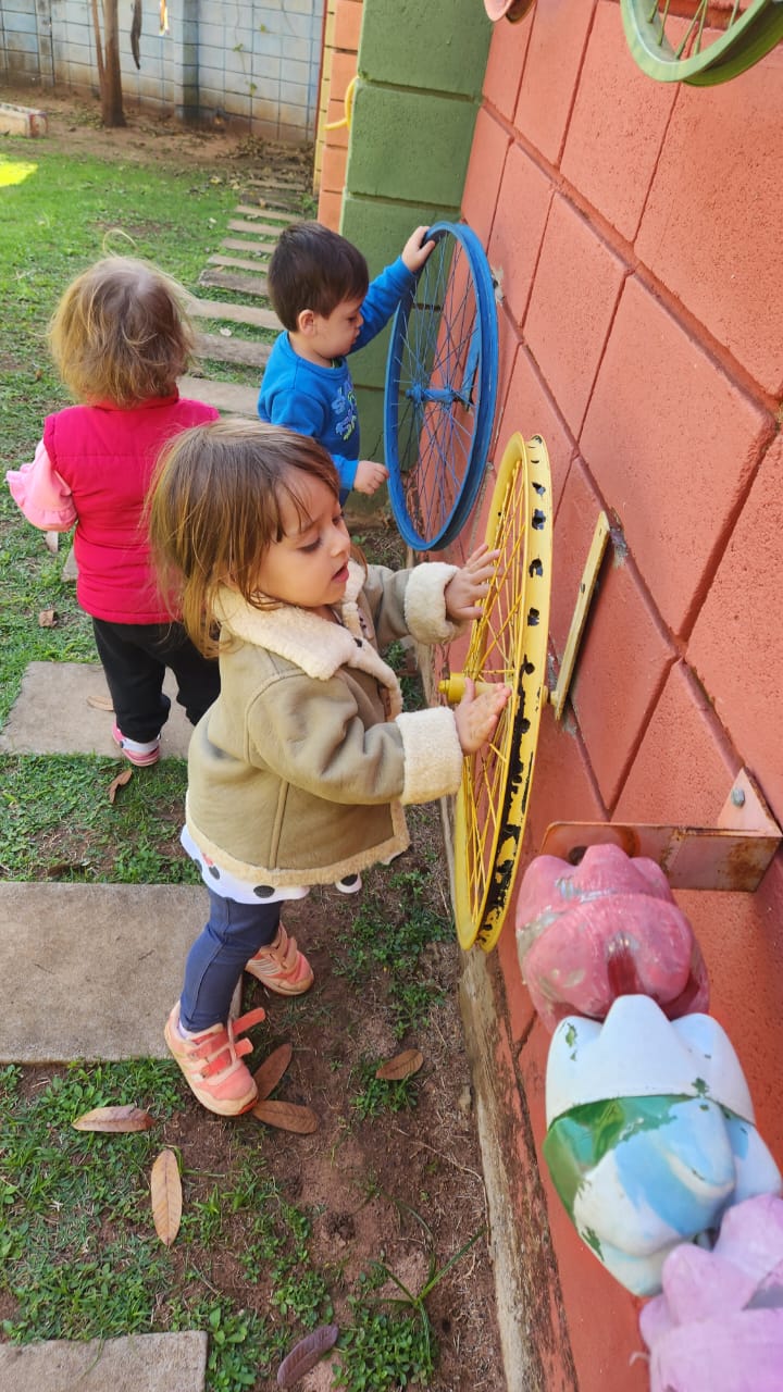 Ao longo da semana, organizamos ricas e encantadoras experiências brincantes com os nossos pequenos. A partir de acolhidas com brincadeiras cantadas e cantigas de roda, ao longo dos dias, vivenciamos diferentes experiências a partir de diversos contextos de aprendizagens que foram organizados por nossas Professoras. Vivenciaram contextos de projeção de estilos musicais no data show e expressão por meio de instrumentos musicais e objetos sonoros. Também vivenciaram contexto com diferentes riscadores e suportes, embalado por cantigas de roda para criar o ritmo da expressão. As crianças exploraram diferentes desafios e movimentos com o seu corpo a partir de divertidos circuitos. Finalizamos a semana em meio a natureza, com a organização de sessões heurísticas e bandejas de experimentações.