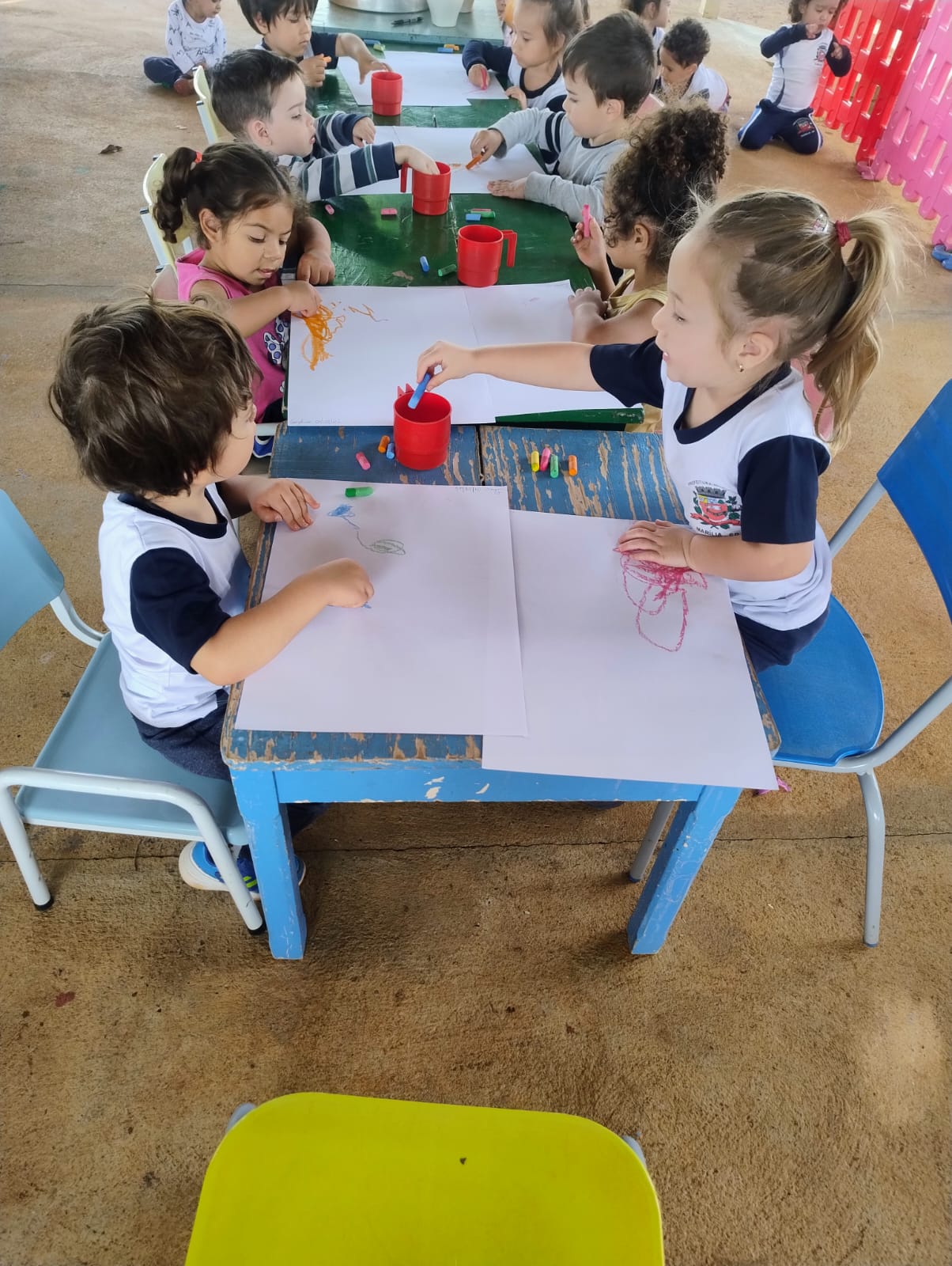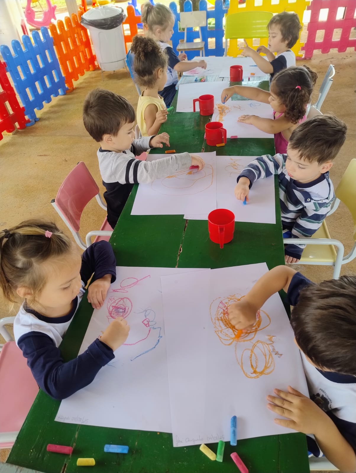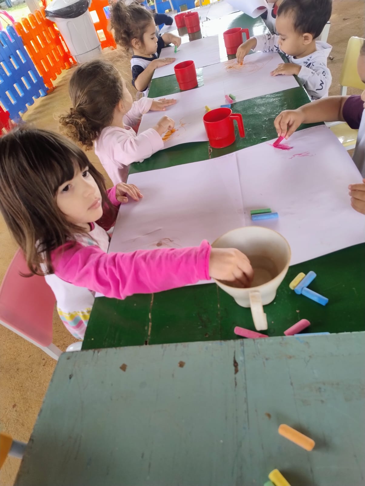 A turma Voando na Imaginação (Maternal 1 B), ao lado da Professora Valéria e da auxiliar Keity vivenciaram a experiência de produzir suas marcas gráficas utilizand a técnica de riscar com o giz de lousa molhado. Foi um momento de muita partilha e descobertas, em que as crianças puderam fazer suas escolhas e socializar com os amigos.