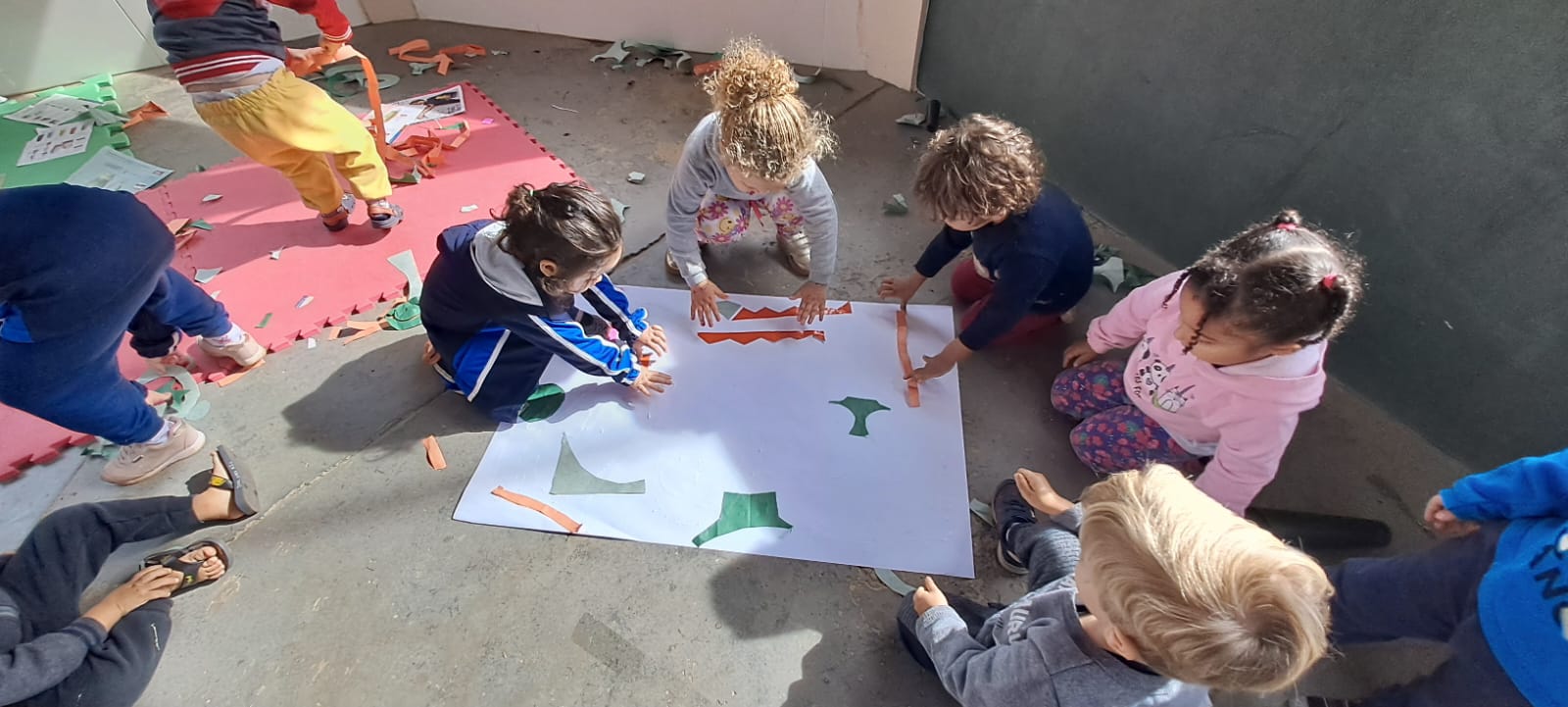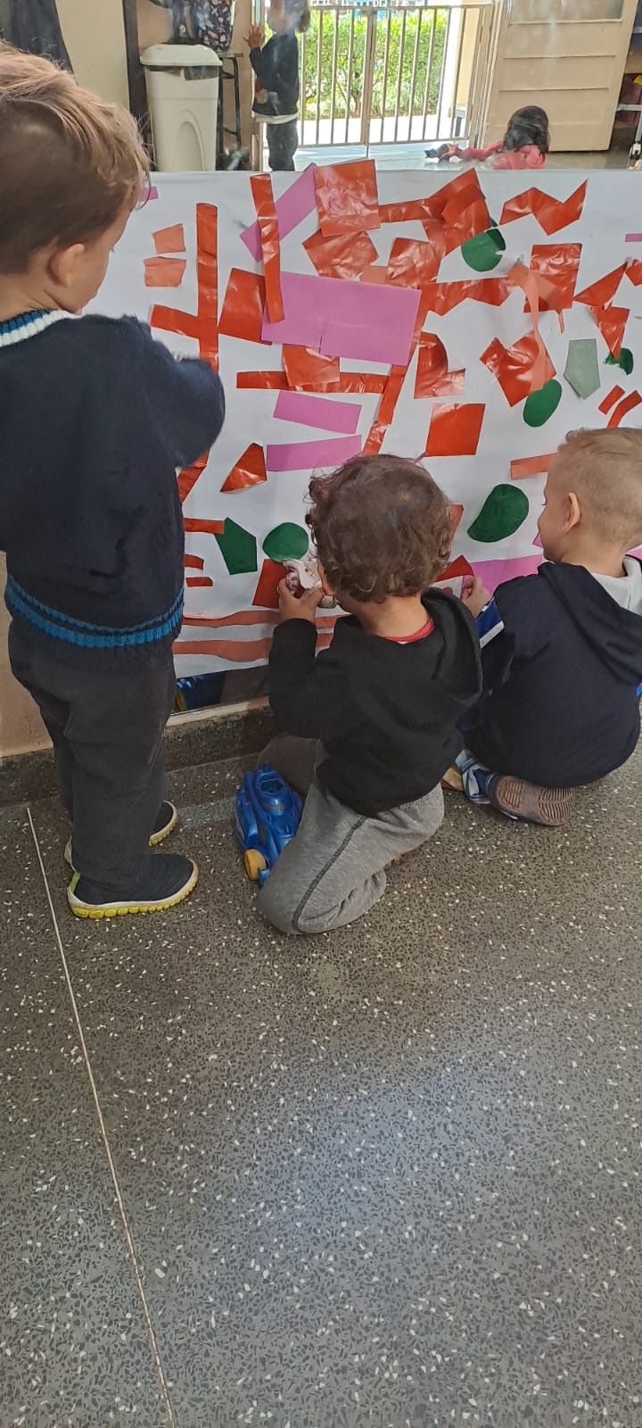A turma a Baleia (Maternal 1 A) realizou um contexto de aprendizagem de expressão da arte. Neste contexto o elemento de curiosidade foi a cola. As crianças ficaram encantadas com a textura e a mudança que ela provocava no papel ao colar, assim como as marcas que deixava em suas mãos. A professora Paula disponibilizou diversos recortes de papeis diversificados para que as crianças pudessem ir realizando suas escolhas e produzindo suas criações expressivas. Ao final, a linda obra de arte foi levada para a sala de referência para estampar e ficar visível. As crianças contemplaram e falaram sobre sua arte!