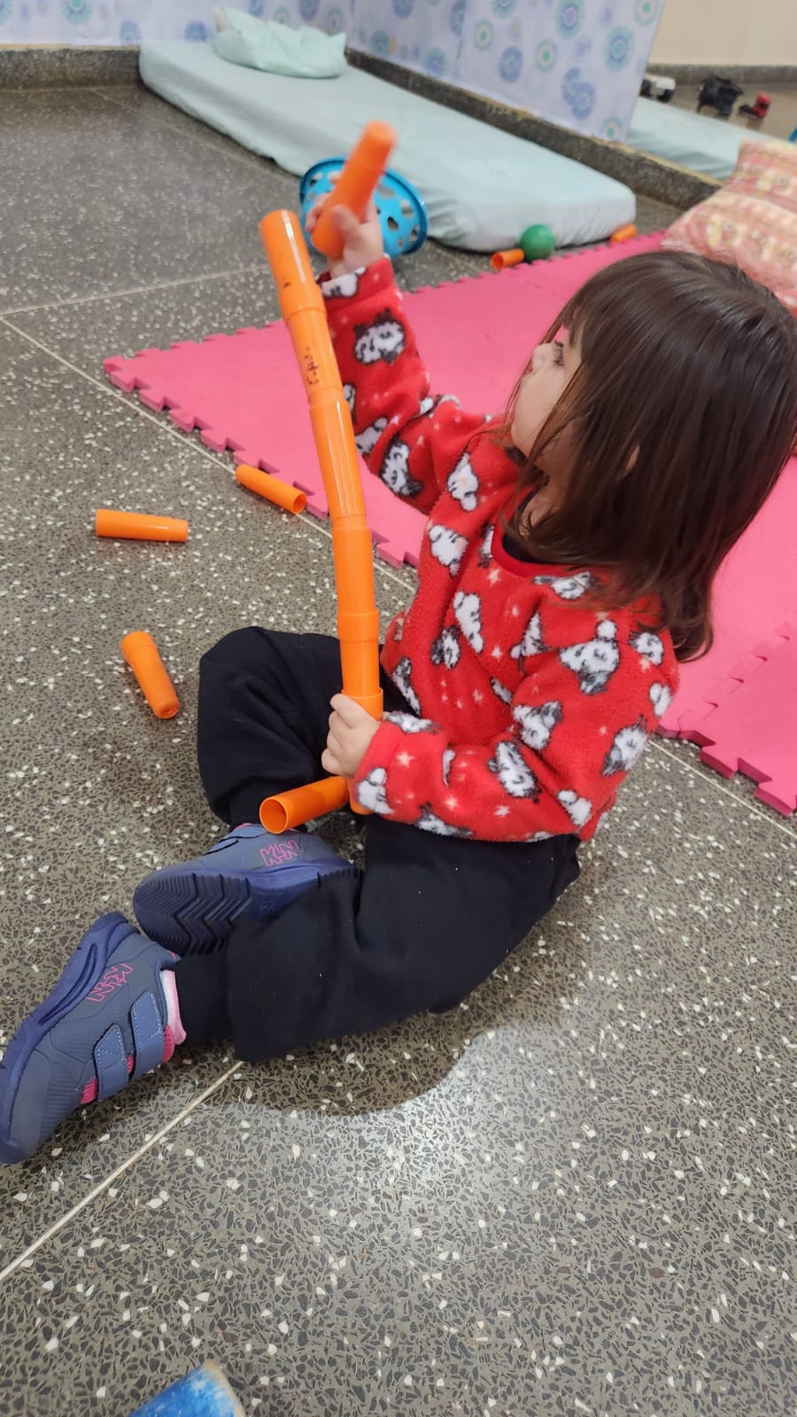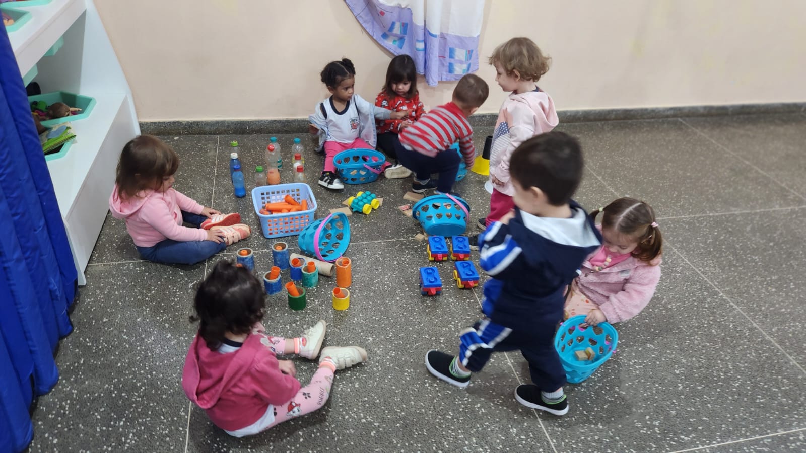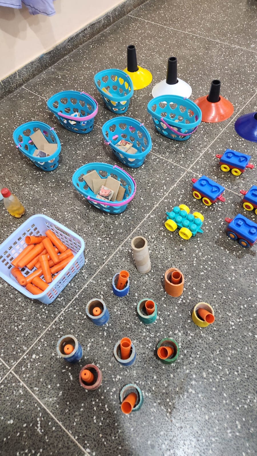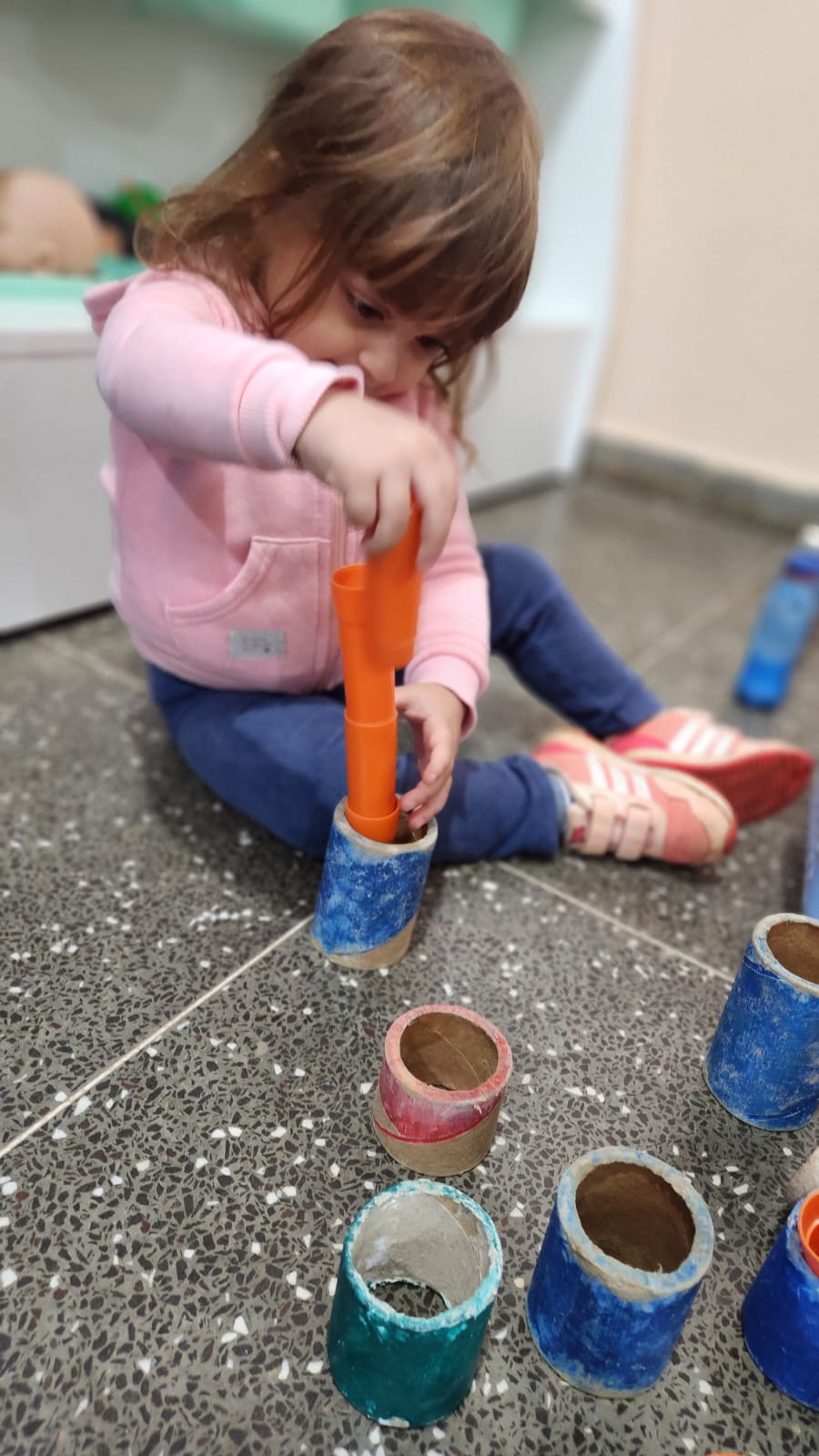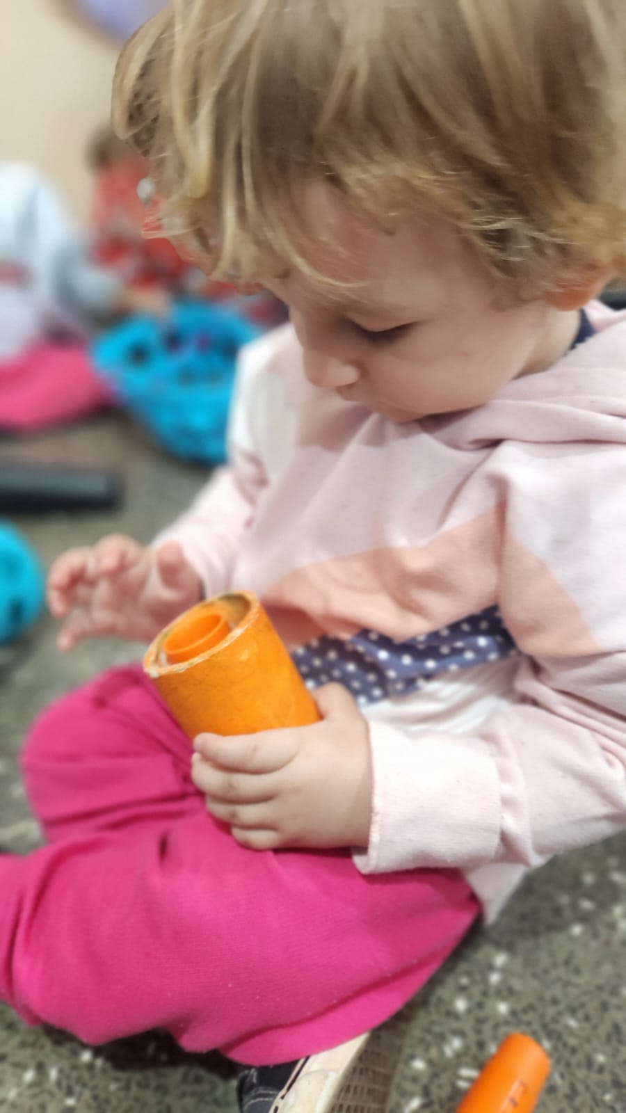 Ao entrarem no espaço, as crianças se aproximaram com curiosidade. Algumas iniciaram a exploração com as garrafinhas sensoriais, outras preferiram os carretéis e tubos, testando encaixes e empilhamentos. Sentadas no chão, elas manipulavam os objetos com atenção, e se encantavam com os sons, formas e texturas presentes na proposta. A proposta foi vivenciada com liberdade e encantamento. A cada movimento, uma nova descoberta era feita: o som de uma garrafinha ao ser chacoalhada, o desafio de empilhar rolos com equilíbrio ou o prazer de encher as cestinhas com os pequenos objetos coloridos.